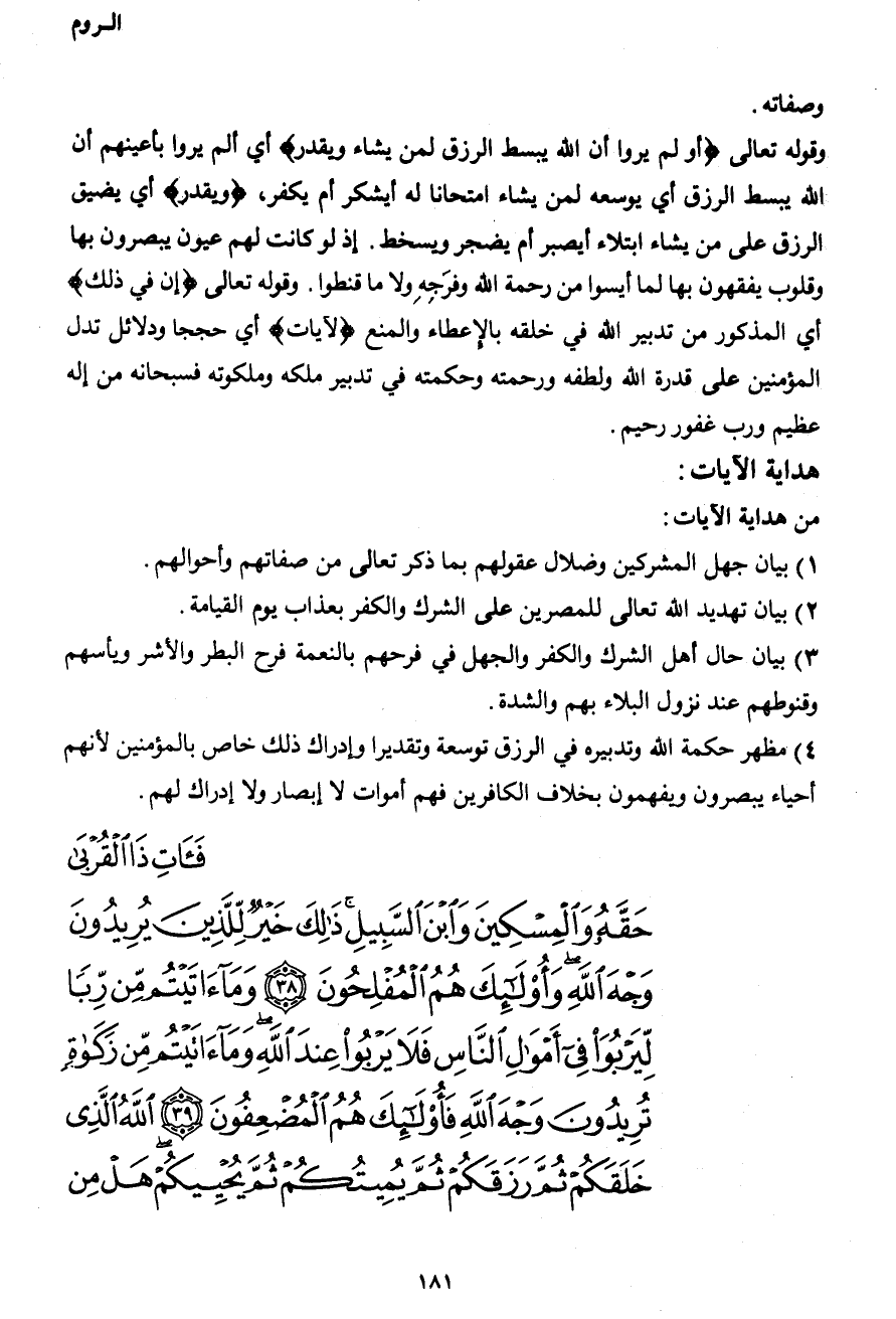 فَآتِ ذَا الْقُرْبَى حَقَّهُ وَالْمِسْكِينَ وَابْنَ السَّبِيلِ ذَلِكَ خَيْرٌ لِلَّذِينَ يُرِيدُونَ وَجْهَ اللهِ وَأُولَئِكَ هُمُ الْمُفْلِحُونَ (38) وَمَا آتَيْتُمْ مِنْ رِباً لِيَرْبُوَ فِي أَمْوَالِ النَّاسِ فَلا يَرْبُو عِنْدَ اللهِ وَمَا آتَيْتُمْ مِنْ زَكَاةٍ تُرِيدُونَ وَجْهَ اللهِ فَأُولَئِكَ هُمُ الْمُضْعِفُونَ (39) اللهُ الَّذِي خَلَقَكُمْ ثُمَّ رَزَقَكُمْ ثُمَّ يُمِيتُكُمْ ثُمَّ يُحْيِيكُمْ هَلْ مِنْ