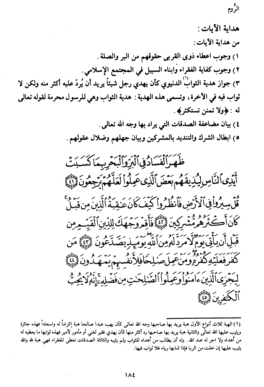 ظَهَرَ الْفَسَادُ فِي الْبَرِّ وَالْبَحْرِ بِمَا كَسَبَتْ أَيْدِي النَّاسِ لِيُذِيقَهُمْ بَعْضَ الَّذِي عَمِلُوا لَعَلَّهُمْ يَرْجِعُونَ (41) قُلْ سِيرُوا فِي الْأَرْضِ فَانْظُرُوا كَيْفَ كَانَ عَاقِبَةُ الَّذِينَ مِنْ قَبْلُ كَانَ أَكْثَرُهُمْ مُشْرِكِينَ (42) فَأَقِمْ وَجْهَكَ لِلدِّينِ الْقَيِّمِ مِنْ قَبْلِ أَنْ يَأْتِيَ يَوْمٌ لا مَرَدَّ لَهُ مِنَ اللهِ يَوْمَئِذٍ يَصَّدَّعُونَ (43) مَنْ كَفَرَ فَعَلَيْهِ كُفْرُهُ وَمَنْ عَمِلَ صَالِحاً فَلِأَنْفُسِهِمْ يَمْهَدُونَ (44)