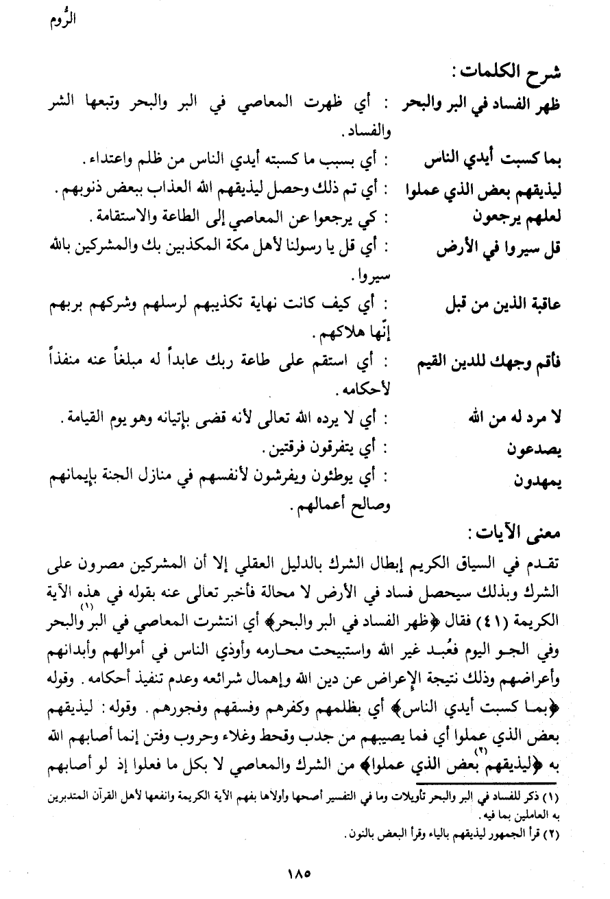تقدم في السياق الكريم إبطال الشرك بالدليل العقلي إلا أن المشركين مصرون على الشرك وبذلك سيحصل فساد في الأرض لا محالة فأخبر تعالى عنه بقوله في هذه الآية الكريمة (41) فقال {ظَهَرَ الْفَسَادُ فِي الْبَرِّ وَالْبَحْرِ} أي انتشرت المعاصي في البر (1) والبحر وفي الجو اليوم فعُبد غير الله واستبيحت محارمه وأوذي الناس في أموالهم وأبدانهم وأعراضهم وذلك نتيجة الإعراض عن دين الله وإهمال شرائعه وعدم تنفيذ أحكامه. وقوله {بِمَا كَسَبَتْ أَيْدِي النَّاسِ} أي بظلمهم وكفرهم وفسقهم وفجورهم. وقوله: ليذيقهم بعض الذي عملوا أي فما يصيبهم من جدب وقحط وغلاء وحروب وفتن إنما أصابهم الله به {لِيُذِيقَهُمْ (2) بَعْضَ الَّذِي عَمِلُوا} من الشرك والمعاصي لا بكل ما فعلوا إذ لو أصابهم