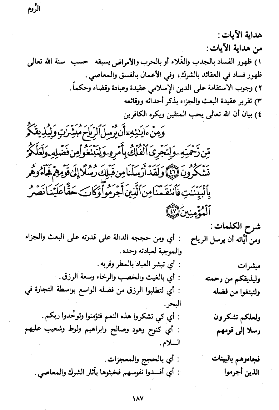 وَمِنْ آيَاتِهِ أَنْ يُرْسِلَ الرِّيَاحَ مُبَشِّرَاتٍ وَلِيُذِيقَكُمْ مِنْ رَحْمَتِهِ وَلِتَجْرِيَ الْفُلْكُ بِأَمْرِهِ وَلِتَبْتَغُوا مِنْ فَضْلِهِ وَلَعَلَّكُمْ تَشْكُرُونَ (46) وَلَقَدْ أَرْسَلْنَا مِنْ قَبْلِكَ رُسُلاً إِلَى قَوْمِهِمْ فَجَاءُوهُمْ بِالْبَيِّنَاتِ فَانْتَقَمْنَا مِنَ الَّذِينَ أَجْرَمُوا وَكَانَ حَقّاً عَلَيْنَا نَصْرُ الْمُؤْمِنِينَ (47)