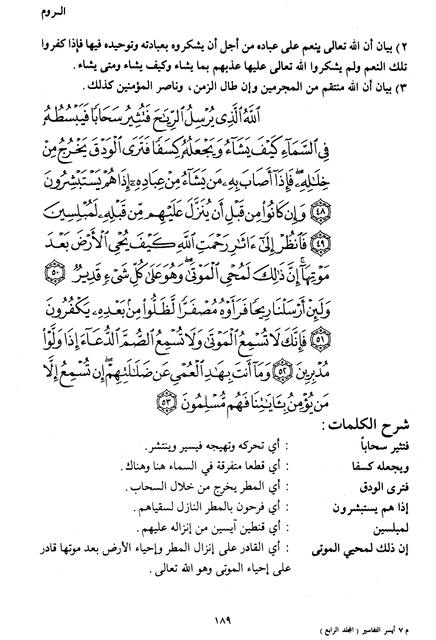 اللهُ الَّذِي يُرْسِلُ الرِّيَاحَ فَتُثِيرُ سَحَاباً فَيَبْسُطُهُ فِي السَّمَاءِ كَيْفَ يَشَاءُ وَيَجْعَلُهُ كِسَفاً فَتَرَى الْوَدْقَ يَخْرُجُ مِنْ خِلالِهِ فَإِذَا أَصَابَ بِهِ مَنْ يَشَاءُ مِنْ عِبَادِهِ إِذَا هُمْ يَسْتَبْشِرُونَ (48) وَإِنْ كَانُوا مِنْ قَبْلِ أَنْ يُنَزَّلَ عَلَيْهِمْ مِنْ قَبْلِهِ لَمُبْلِسِينَ (49) فَانْظُرْ إِلَى آثَارِ رَحْمَتِ اللهِ كَيْفَ يُحْيِي الْأَرْضَ بَعْدَ مَوْتِهَا إِنَّ ذَلِكَ لَمُحْيِي الْمَوْتَى وَهُوَ عَلَى كُلِّ شَيْءٍ قَدِيرٌ (50) وَلَئِنْ أَرْسَلْنَا رِيحاً فَرَأَوْهُ مُصْفَرّاً لَظَلُّوا مِنْ بَعْدِهِ يَكْفُرُونَ (51) فََإِنَّكَ لا تُسْمِعُ الْمَوْتَى وَلا تُسْمِعُ الصُّمَّ الدُّعَاءَ إِذَا وَلَّوْا مُدْبِرِينَ (52) وَمَا أَنْتَ بِهَادِ الْعُمْيِ عَنْ ضَلالَتِهِمْ إِنْ تُسْمِعُ إِلَّا مَنْ يُؤْمِنُ بِآياتِنَا فَهُمْ مُسْلِمُونَ (53)