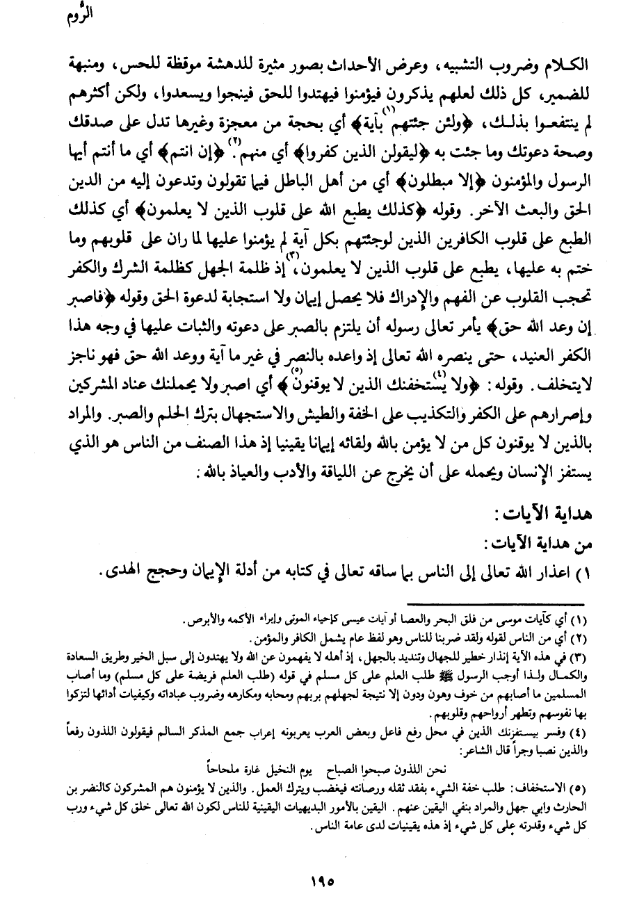 الكلام وضروب التشبيه، وعرض الأحداث بصورة مثيرة للدهشة موقظة للحس، ومنبهة للضمير، كل ذلك لعلهم يذكرون فيؤمنوا فيهتدوا للحق فينجوا ويسعدوا، ولكن أكثرهم لم ينتفعوا بذلك، {وَلَئِنْ جِئْتَهُمْ بِآيَةٍ (1) } أي بحجة من معجزة وغيرها تدل على صدقك وصحة دعوتك وما جئت به {لَيَقُولَنَّ الَّذِينَ كَفَرُوا} أي منهم (2) . {إِنْ أَنْتُمْ} أي ما أنتم أيها الرسول والمؤمنون {إِلَّا مُبْطِلُونَ} أي من أهل الباطل فيما تقولون وتدعون إليه من الدين الحق والبعث الآخر. وقوله {كَذَلِكَ يَطْبَعُ اللهُ عَلَى قُلُوبِ الَّذِينَ لا يَعْلَمُونَ} أي كذلك الطبع على قلوب الكافرين الذين لو جئتهم بكل آية لم يؤمنوا عليها لما ران على قلوبهم وما ختم به عليها، يطبع الله على قلوب الذين يعلمون (3) ، إذ ظلمة الجهل كظلمة الشرك والكفر تحجب القلوب عن الفهم والإدراك فلا يحصل إيمان ولا استجابة لدعوة الحق وقوله {فَاصْبِرْ إِنَّ وَعْدَ اللهِ حَقٌّ} يأمر تعالى رسوله أن يلتزم بالصبر على دعوته والثبات عليها في وجه هذا الكفر العنيد، حتى ينصره الله تعالى إذ واعده بالنصر في غير ما آية ووعد الله حق فهو ناجز لا يتخلف. وقوله: {وَلا يَسْتَخِفَّنَّكَ (4) الَّذِينَ لا يُوقِنُونَ (5) } أي اصبر ولا يحملنك عناد المشركين وإصرارهم على الكفر والتكذيب على الخفة والطيش والاستجهال بترك الحلم والصبر. والمراد بالذين لا يوقنون كل من لا يؤمن بالله ولقائه إيماًنا يقينيا إذ هذا الصنف من الناس هو الذي يستفز الإنسان ويحمله على أن يخرج عن اللياقة والأدب والعياذ بالله.