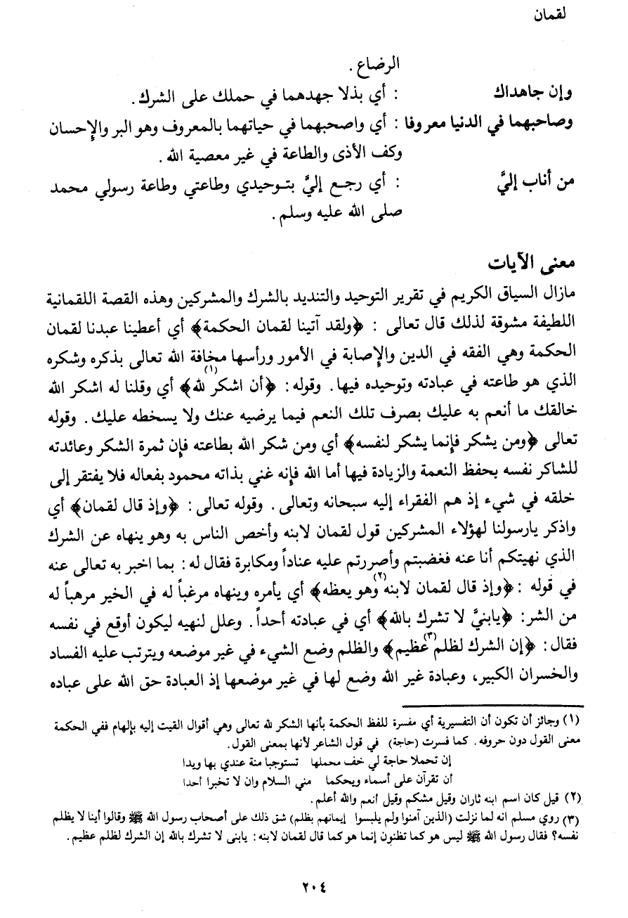 ما زال السياق الكريم في تقرير التوحيد والتنديد بالشرك والمشركين وهذه القصة اللقمانية اللطيفة مشوقة لذلك قال تعالى: {وَلَقَدْ آتَيْنَا لُقْمَانَ الْحِكْمَةَ} أي أعطينا عبدنا لقمان الحكمة وهي الفقه في الدين والإصابة في الأمور ورأسها مخافة الله تعالى بذكره وشكره الذي هو طاعته في عبادته وتوحيده فيها. وقوله: {أَنِ (1) اشْكُرْ لِلَّهِ} أي وقلنا له اشكر الله خالقك ما أنعم به عليك بصرف تلك النعم فيما يرضيه عنك ولا يسخطه عليك. وقوله تعالى {وَمَنْ يَشْكُرْ فَإِنَّمَا يَشْكُرُ لِنَفْسِهِ} أي ومن شكر الله بطاته فإن ثمرة الشكر وعائدته للشاكر نفسه بحفظ النعمة والزيادة فيها أما الله فإنه غني بذاته محمود بفعاله فلا يفتقر إلى خلقه في شيء إذ هم الفقراء إليه سبحانه وتعالى. وقوله تعالى: {وَإِذْ قَالَ لُقْمَانُ} أي واذكر يا رسولنا لهؤلاء المشركين قول لقمان لابنه وأخص الناس به وهو ينهاه عن الشرك الذي نهيتكم أنا عنه فغضبتم وأصررتم عليه عناداً ومكابرة فقال له: بما أخبر به تعالى عنه في قوله: {وَإِذْ قَالَ لُقْمَانُ لاِبْنِهِ (2) وَهُوَ يَعِظُهُ} أي يأمره وينهاه مرغباً له في الخير مرهبا له من الشر: {يَا بُنَيَّ لا تُشْرِكْ بِاللهِ} أي في عبادته أحدا. وعلل لنهيه ليكون أوقع في نفسه فقال: {إِنَّ الشِّرْكَ لَظُلْمٌ (3) عَظِيمٌ} والظلم هو وضع الشيء في غير موضعه ويترتب عليه الفساد والخسران الكبير، وعبادة غير الله وضع لها في غير موضعها إذ العبادة حق الله على عباده