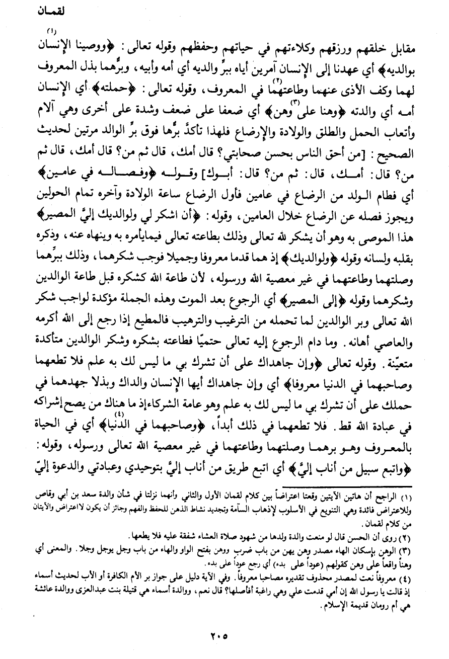 4 - نعت لمصدر محذوف تقديره مصاحباً معروفاً. وفي الآية دليل على جواز بر الأم الكافرة أو الأب لحديث أسماء إذ قالت يا رسول الله إن أمي قدمت علي وهي راغبة أفأصلها؟ قال نعم، ووالدة أسماء هي قتيلة بنت عبد العزى ووالدة عائشة هي أم رمان قديمة الإسلام.