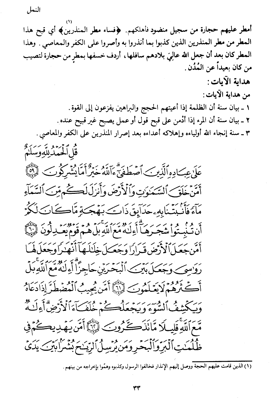 قُلِ الْحَمْدُ لِلَّهِ وَسَلامٌ عَلَى عِبَادِهِ الَّذِينَ اصْطَفَى آللَّهُ خَيْرٌ أَمَّا يُشْرِكُونَ (59) أَمَّنْ خَلَقَ السَّمَاوَاتِ وَالْأَرْضَ وَأَنْزَلَ لَكُمْ مِنَ السَّمَاءِ مَاءً فَأَنْبَتْنَا بِهِ حَدَائِقَ ذَاتَ بَهْجَةٍ مَا كَانَ لَكُمْ أَنْ تُنْبِتُوا شَجَرَهَا أَإِلَهٌ مَعَ اللهِ بَلْ هُمْ قَوْمٌ يَعْدِلُونَ (60) أَمَّنْ جَعَلَ الْأَرْضَ قَرَاراً وَجَعَلَ خِلالَهَا أَنْهَاراً وَجَعَلَ لَهَا رَوَاسِيَ وَجَعَلَ بَيْنَ الْبَحْرَيْنِ حَاجِزاً أَإِلَهٌ مَعَ اللهِ بَلْ أَكْثَرُهُمْ لا يَعْلَمُونَ (61) أَمَّنْ يُجِيبُ الْمُضْطَرَّ إِذَا دَعَاهُ وَيَكْشِفُ السُّوءَ وَيَجْعَلُكُمْ خُلَفَاءَ الْأَرْضِ أَإِلَهٌ مَعَ اللهِ قَلِيلاً مَا تَذَكَّرُونَ (62) أَمَّنْ يَهْدِيكُمْ فِي ظُلُمَاتِ الْبَرِّ وَالْبَحْرِ وَمَنْ يُرْسِلُ الرِّيَاحَ بُشْراً بَيْنَ يَدَيْ