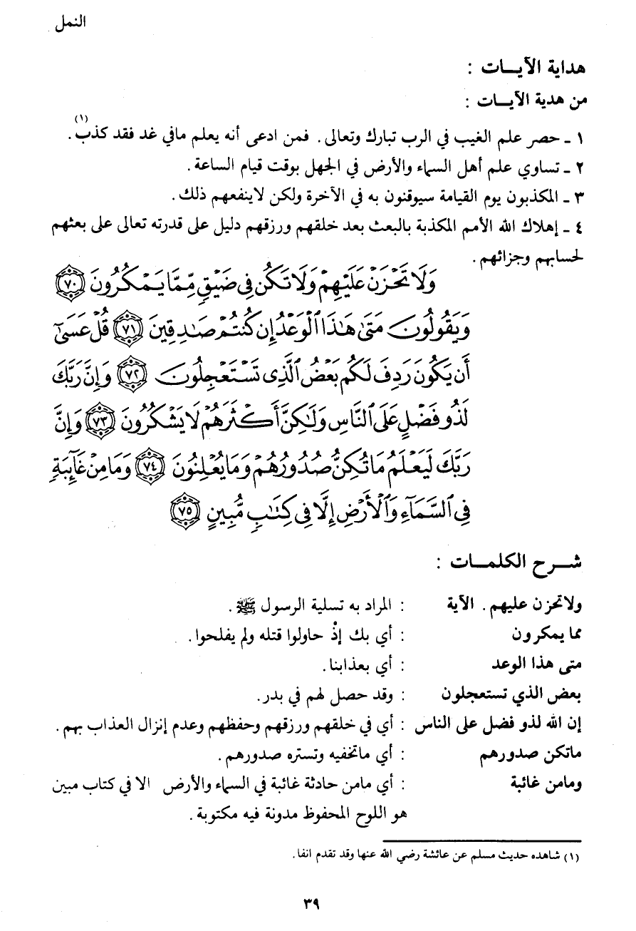 وَلا تَحْزَنْ عَلَيْهِمْ وَلا تَكُنْ فِي ضَيْقٍ مِمَّا يَمْكُرُونَ (70) وَيَقُولُونَ مَتَى هَذَا الْوَعْدُ إِنْ كُنْتُمْ صَادِقِينَ (71) قُلْ عَسَى أَنْ يَكُونَ رَدِفَ لَكُمْ بَعْضُ الَّذِي تَسْتَعْجِلُونَ (72) وَإِنَّ رَبَّكَ لَذُو فَضْلٍ عَلَى النَّاسِ وَلَكِنَّ أَكْثَرَهُمْ لا يَشْكُرُونَ (73) وَإِنَّ رَبَّكَ لَيَعْلَمُ مَا تُكِنُّ صُدُورُهُمْ وَمَا يُعْلِنُونَ (74) وَمَا مِنْ غَائِبَةٍ فِي السَّمَاءِ وَالْأَرْضِ إِلَّا فِي كِتَابٍ مُبِينٍ (75)