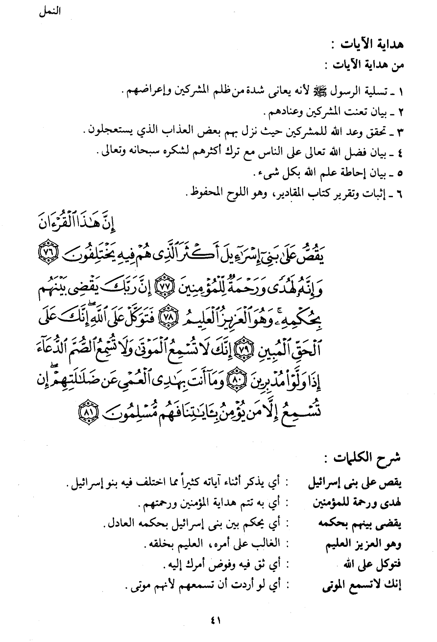 إِنَّ هَذَا الْقُرْآنَ يَقُصُّ عَلَى بَنِي إِسْرائيلَ أَكْثَرَ الَّذِي هُمْ فِيهِ يَخْتَلِفُونَ (76) وَإِنَّهُ لَهُدىً وَرَحْمَةٌ لِلْمُؤْمِنِينَ (77) إِنَّ رَبَّكَ يَقْضِي بَيْنَهُمْ بِحُكْمِهِ وَهُوَ الْعَزِيزُ الْعَلِيمُ (78) فَتَوَكَّلْ عَلَى اللهِ إِنَّكَ عَلَى الْحَقِّ الْمُبِينِ (79) إِنَّكَ لا تُسْمِعُ الْمَوْتَى وَلا تُسْمِعُ الصُّمَّ الدُّعَاءَ إِذَا وَلَّوْا مُدْبِرِينَ (80) وَمَا أَنْتَ بِهَادِي الْعُمْيِ عَنْ ضَلالَتِهِمْ إِنْ تُسْمِعُ إِلَّا مَنْ يُؤْمِنُ بِآياتِنَا فَهُمْ مُسْلِمُونَ (81)