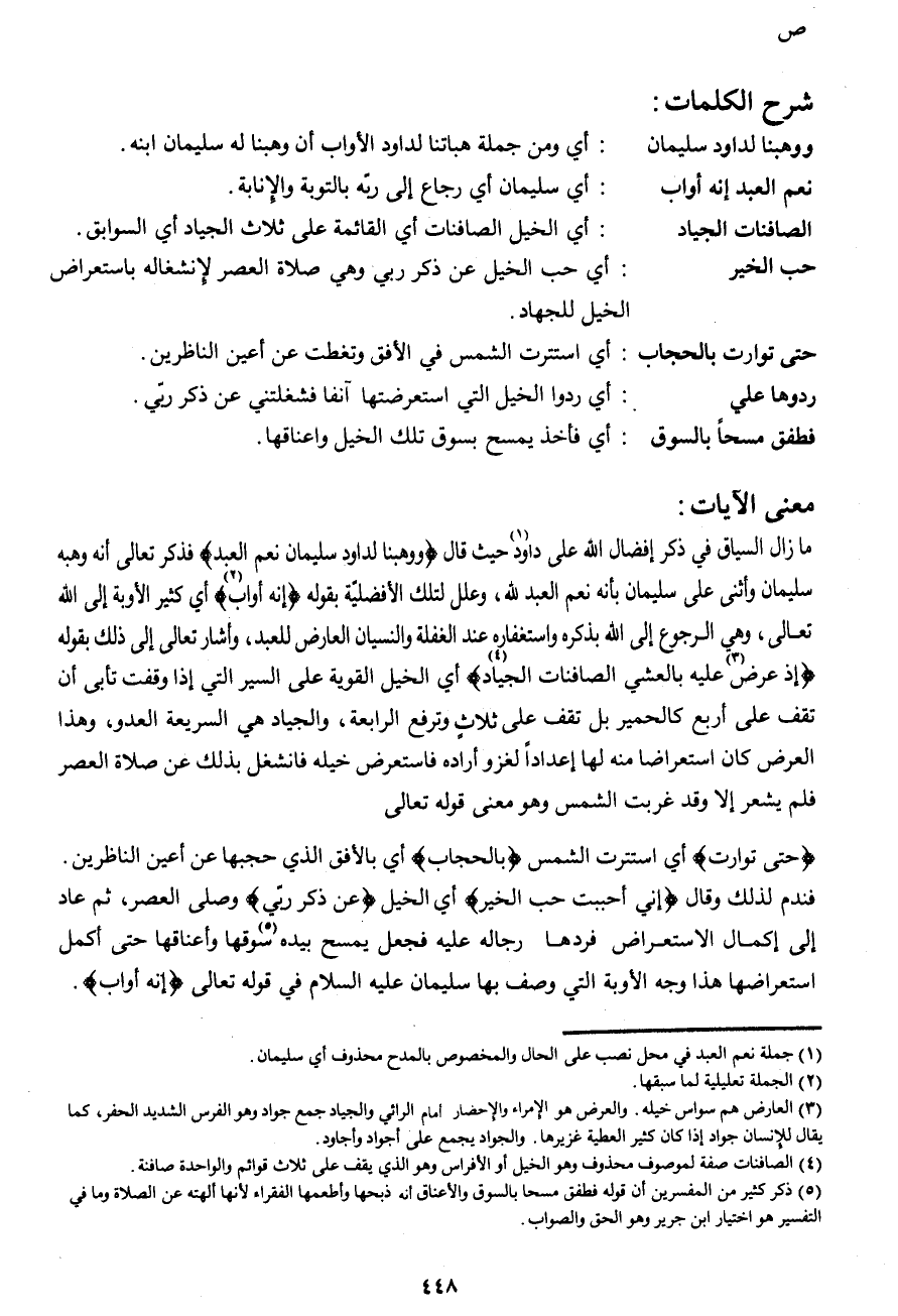 5 - ذكر كثير من المفسرين أن قوله فطفق مسحاً بالسوق والأعناق أنه ذبحها وأطمعها الفقراء لأنها ألهته عن الصلاة وما في التفسير هو اختيار ابن جرير وهو الحق والصواب.