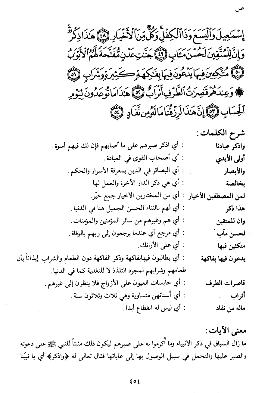 إِسْمَاعِيلَ وَالْيَسَعَ وَذَا الْكِفْلِ وَكُلٌّ مِنَ الْأَخْيَارِ (48) هَذَا ذِكْرٌ وَإِنَّ لِلْمُتَّقِينَ لَحُسْنَ مَآبٍ (49) جَنَّاتِ عَدْنٍ مُفَتَّحَةً لَهُمُ الْأَبْوَابُ (50) مُتَّكِئِينَ فِيهَا يَدْعُونَ فِيهَا بِفَاكِهَةٍ كَثِيرَةٍ وَشَرَابٍ (51) وَعِنْدَهُمْ قَاصِرَاتُ الطَّرْفِ أَتْرَابٌ (52) هَذَا مَا تُوعَدُونَ لِيَوْمِ الْحِسَابِ (53) إِنَّ هَذَا لَرِزْقُنَا مَا لَهُ مِنْ نَفَادٍ (54)