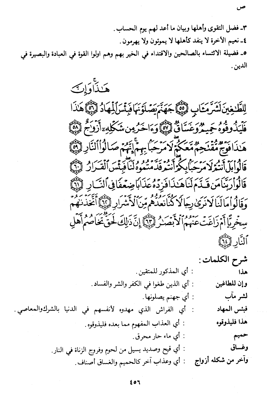 هَذَا وَإِنَّ لِلطَّاغِينَ لَشَرَّ مَآبٍ (55) جَهَنَّمَ يَصْلَوْنَهَا فَبِئْسَ الْمِهَادُ (56) هَذَا فَلْيَذُوقُوهُ حَمِيمٌ وَغَسَّاقٌ (57) وَآخَرُ مِنْ شَكْلِهِ أَزْوَاجٌ (58) هَذَا فَوْجٌ مُقْتَحِمٌ مَعَكُمْ لا مَرْحَباً بِهِمْ إِنَّهُمْ صَالُو النَّارِ (59)