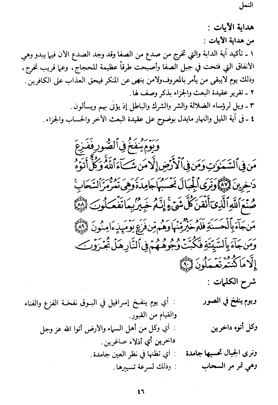 وَيَوْمَ يُنْفَخُ فِي الصُّورِ فَفَزِعَ مَنْ فِي السَّمَاوَاتِ وَمَنْ فِي الأَرْضِ إِلَّا مَنْ شَاءَ اللهُ وَكُلٌّ أَتَوْهُ دَاخِرِينَ (87) وَتَرَى الْجِبَالَ تَحْسَبُهَا جَامِدَةً وَهِيَ تَمُرُّ مَرَّ السَّحَابِ صُنْعَ اللهِ الَّذِي أَتْقَنَ كُلَّ شَيْءٍ إِنَّهُ خَبِيرٌ بِمَا تَفْعَلُونَ (88) مَنْ جَاءَ بِالْحَسَنَةِ فَلَهُ خَيْرٌ مِنْهَا وَهُمْ مِنْ فَزَعٍ يَوْمَئِذٍ آمِنُونَ (89) وَمَنْ جَاءَ بِالسَّيِّئَةِ فَكُبَّتْ وُجُوهُهُمْ فِي النَّارِ هَلْ تُجْزَوْنَ إِلَّا مَا كُنْتُمْ تَعْمَلُونَ (90)