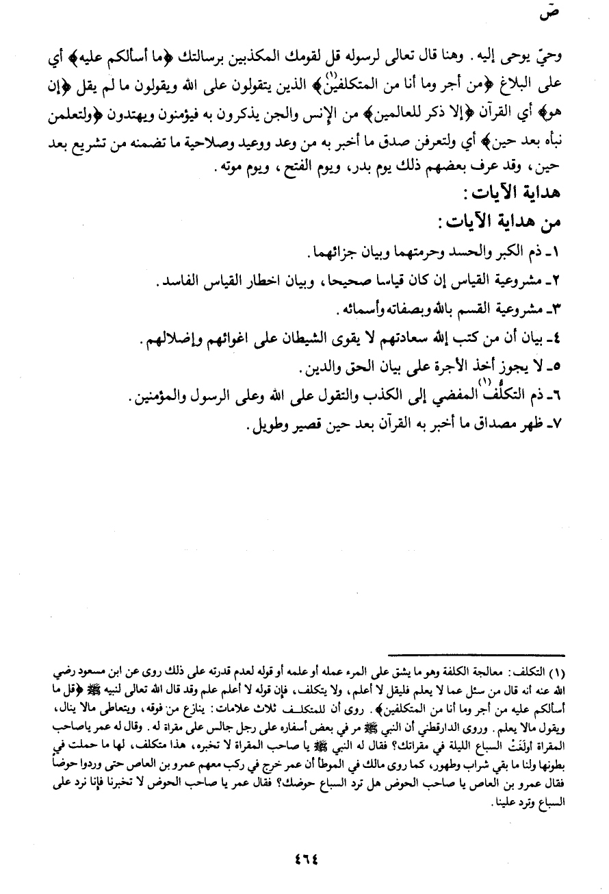 وحي يوحى إليه. وهنا قال تعالى لرسوله قل لقومك المكذبين برسالتك {مَا أَسْأَلُكُمْ عَلَيْهِ} أي على البلاغ {مِنْ أَجْرٍ وَمَا أَنَا مِنَ الْمُتَكَلِّفِينَ (1) } الذين يتقولون على الله ويقولون ما لم يقل {إِنْ هُوَ} أي القرآن {إِلَّا ذِكْرٌ لِلْعَالَمِينَ} من الإنس والجن يذكرون به فيؤمنون ويهتدون {وَلَتَعْلَمُنَّ نَبَأَهُ بَعْدَ حِينٍ} أي ولتعرفن صدق ما أخبر به من وعد ووعيد وصلاحية ما تضمنه من تشريع بعد حين، وقد عرف بعضهم ذلك يوم بدر، ويوم الفتح، ويوم مؤتة.