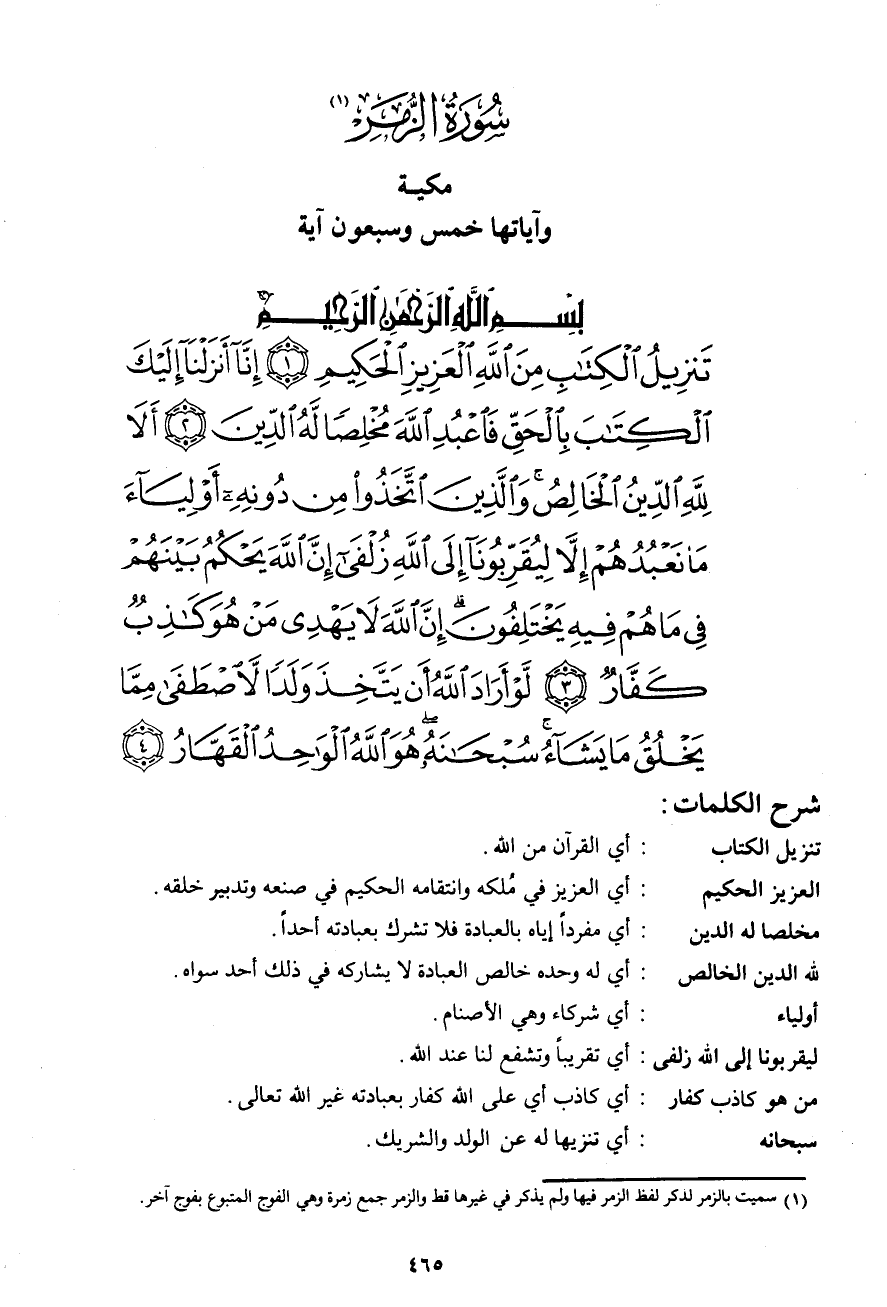تَنْزِيلُ الْكِتَابِ مِنَ اللهِ الْعَزِيزِ الْحَكِيمِ (1) إِنَّا أَنْزَلْنَا إِلَيْكَ الْكِتَابَ بِالْحَقِّ فَاعْبُدِ اللهَ مُخْلِصاً لَهُ الدِّينَ (2) أَلا لِلَّهِ الدِّينُ الْخَالِصُ وَالَّذِينَ اتَّخَذُوا مِنْ دُونِهِ أَوْلِيَاءَ مَا نَعْبُدُهُمْ إِلَّا لِيُقَرِّبُونَا إِلَى اللهِ زُلْفَى إِنَّ اللهَ يَحْكُمُ بَيْنَهُمْ فِي مَا هُمْ فِيهِ يَخْتَلِفُونَ إِنَّ اللهَ لا يَهْدِي مَنْ هُوَ كَاذِبٌ كَفَّارٌ (3) لَوْ أَرَادَ اللهُ أَنْ يَتَّخِذَ وَلَداً لاصْطَفَى مِمَّا يَخْلُقُ مَا يَشَاءُ سُبْحَانَهُ هُوَ اللهُ الْوَاحِدُ الْقَهَّارُ (4)