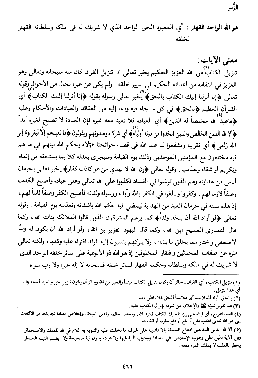 {تَنْزِيلُ الْكِتَابِ (1) مِنَ اللهِ الْعَزِيزِ الْحَكِيمِ} يخبر تعالى أن تنزيل القرآن كان منه سبحانه وتعالى وهو العزيز في انتقامه من أعدائه الحكيم في تدبير خلقه. ولم يكن عن غيره بحال من الأحوال وقوله تعالى {إِنَّا أَنْزَلْنَا إِلَيْكَ الْكِتَابَ بِالْحَقِّ} (2) يخبر تعالى رسوله بقوله {إِنَّا أَنْزَلْنَا إِلَيْكَ الْكِتَابَ (3) } أي القرآن العظيم {بِالْحَقِّ} في كل ما جاء فيه ودعا إليه من العقائد والعبادات والأحكام وعليه {فَاعْبُدِ (4) اللهَ مُخْلِصاً لَهُ الدِّينَ} أي العبادة فلا تعبد معه غيره فإن العبادة لا تصلح لغيره أبداً {أَلا لِلَّهِ الدِّينُ الْخَالِصُ وَالَّذِينَ اتَّخَذُوا مِنْ دُونِهِ أَوْلِيَاءَ (5) } أي شركاء يعبدونهم ويقولون {مَا نَعْبُدُهُمْ إِلَّا لِيُقَرِّبُونَا إِلَى اللهِ زُلْفَى} أي تقريبا ويشفعوا لنا عند الله في قضاء حوائجنا هؤلاء يحكم الله بينهم في ما هم فيه مختلفون مع المؤمنين الموحدين وذلك يوم القيامة وسيجزي بعدله كلا بما يستحقه من إنعام وتكريم أو شقاء وتعذيب. وقوله تعالى {إِنَّ اللهَ لا يَهْدِي مَنْ هُوَ كَاذِبٌ كَفَّارٌ} يخبر تعالى بحرمان أناس من هدايته وهم الذين توغلوا في الفساد فكذبوا على الله تعالى وعلى عباده وأصبح الكذب وصفاً لازماً لهم، وكفروا وبالغوا في الكفر بالله وآياته ورسوله ولقائه فأصبح الكفر وصفاً ثابتاً لهم، إذ هذه سنته في حرمان العبد من الهداية ليمضي فيه حكم الله بإشقائه وتعذيبه يوم القيامة. وقوله تعالى {لَوْ أَرَادَ اللهُ أَنْ يَتَّخِذَ وَلَداً} كما يزعم المشركون الذين قالوا الملائكة بنات الله، وكما قال النصارى المسيح ابن الله، وكما قال اليهود عزير ابن الله، ولو أراد الله أن يكون له ولد لاصطفى واختار مما يخلق ما يشاء، ولا يتركهم ينسبون إليه الولد افتراء عليه وكذباً، ولكنه تعالى منزه عن صفات المحدثين وافتقار المخلوقين إذ هو الله ذو الألوهية على سائر خلقه الواحد الذي لا شريك له في ملكه وسلطانه وحكمه القهار لسائر خلقه فسبحانه لا إله غيره ولا رب سواه.