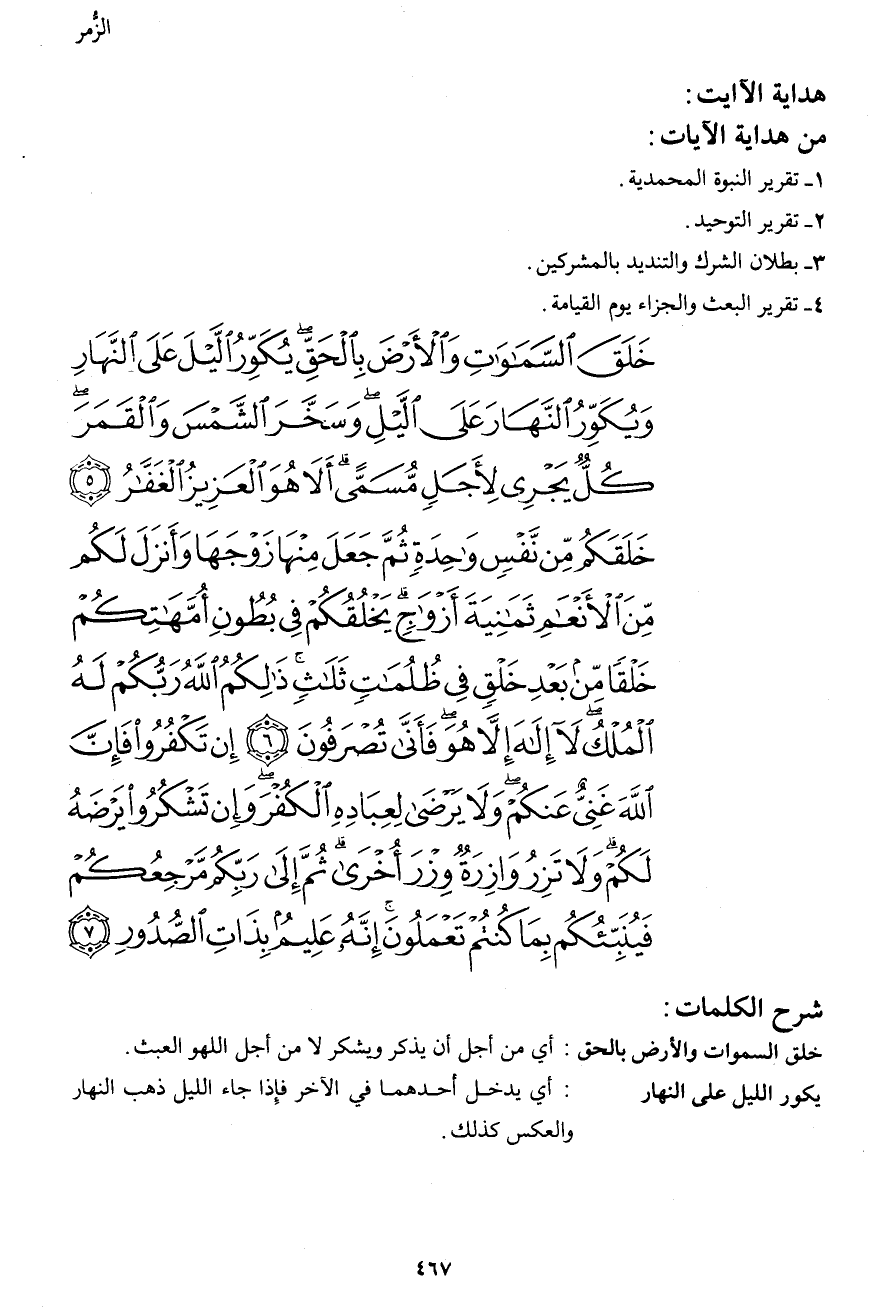خَلَقَ السَّمَاوَاتِ وَالْأَرْضَ بِالْحَقِّ يُكَوِّرُ اللَّيْلَ عَلَى النَّهَارِ وَيُكَوِّرُ النَّهَارَ عَلَى اللَّيْلِ وَسَخَّرَ الشَّمْسَ وَالْقَمَرَ كُلٌّ يَجْرِي لِأَجَلٍ مُسَمّىً أَلا هُوَ الْعَزِيزُ الْغَفَّارُ (5) خَلَقَكُمْ مِنْ نَفْسٍ وَاحِدَةٍ ثُمَّ جَعَلَ مِنْهَا زَوْجَهَا وَأَنْزَلَ لَكُمْ مِنَ الْأَنْعَامِ ثَمَانِيَةَ أَزْوَاجٍ يَخْلُقُكُمْ فِي بُطُونِ أُمَّهَاتِكُمْ خَلْقاً مِنْ بَعْدِ خَلْقٍ فِي ظُلُمَاتٍ ثَلاثٍ ذَلِكُمُ اللهُ رَبُّكُمْ لَهُ الْمُلْكُ لا إِلَهَ إِلَّا هُوَ فَأَنَّى تُصْرَفُونَ (6) إِنْ تَكْفُرُوا فَإِنَّ اللهَ غَنِيٌّ عَنْكُمْ وَلا يَرْضَى لِعِبَادِهِ الْكُفْرَ وَإِنْ تَشْكُرُوا يَرْضَهُ لَكُمْ وَلا تَزِرُ وَازِرَةٌ وِزْرَ أُخْرَى ثُمَّ إِلَى رَبِّكُمْ مَرْجِعُكُمْ فَيُنَبِّئُكُمْ بِمَا كُنْتُمْ تَعْمَلُونَ إِنَّهُ عَلِيمٌ بِذَاتِ الصُّدُورِ (7)