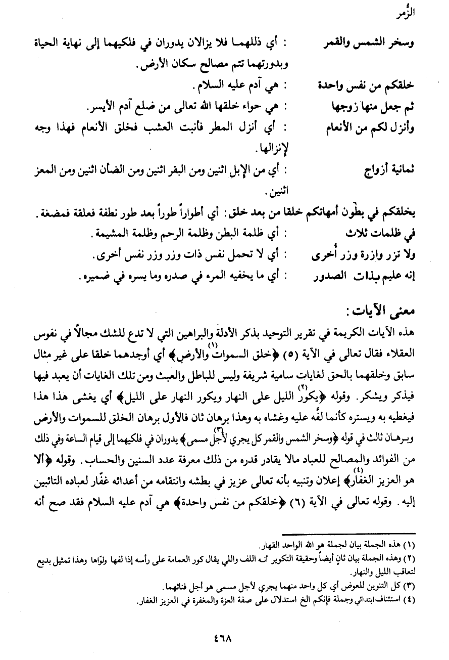 هذه الآيات الكريمة في تقرير التوحيد بذكر الأدلة والبراهين التي لا تدع للشك مجالاً في نفوس العقلاء فقال تعالى في الآية (5) {خَلَقَ السَّمَاوَاتِ (1) وَالْأَرْضَ} أي أوجدهما خلقاً على غير مثال سابق وخلقهما بالحق لغايات سامية شريفة وليس للباطل والعبث ومن تلك الغايات أن يعبد فيها فيذكر ويشكر. وقوله {يُكَوِّرُ (2) اللَّيْلَ عَلَى النَّهَارِ وَيُكَوِّرُ النَّهَارَ عَلَى اللَّيْلِ} أي يغشي هذا هذا فيغطيه به ويستره كأنما لفّه عليه وغشاه به وهذا برهان ثان فالأول برهان الخلق للسموات والأرض وبرهان ثالث في قوله {وَسَخَّرَ الشَّمْسَ وَالْقَمَرَ كُلٌّ يَجْرِي لِأَجَلٍ (3) مُسَمّىً} يدوران في فلكيهما إلى قيام الساعة وفي ذلك من الفوائد والمصالح للعباد ما لا يقادر قدره من ذلك معرفة عدد السنين والحساب. وقوله {أَلا هُوَ الْعَزِيزُ الْغَفَّارُ (4) } إعلان وتنبيه بأنه تعالى عزيز في بطشه وانتقامه من أعدائه غفّار لعباده التائبين إليه. وقوله تعالى في الآية (6) {خَلَقَكُمْ مِنْ نَفْسٍ وَاحِدَةٍ} هي آدم عليه السلام فقد صح أنه