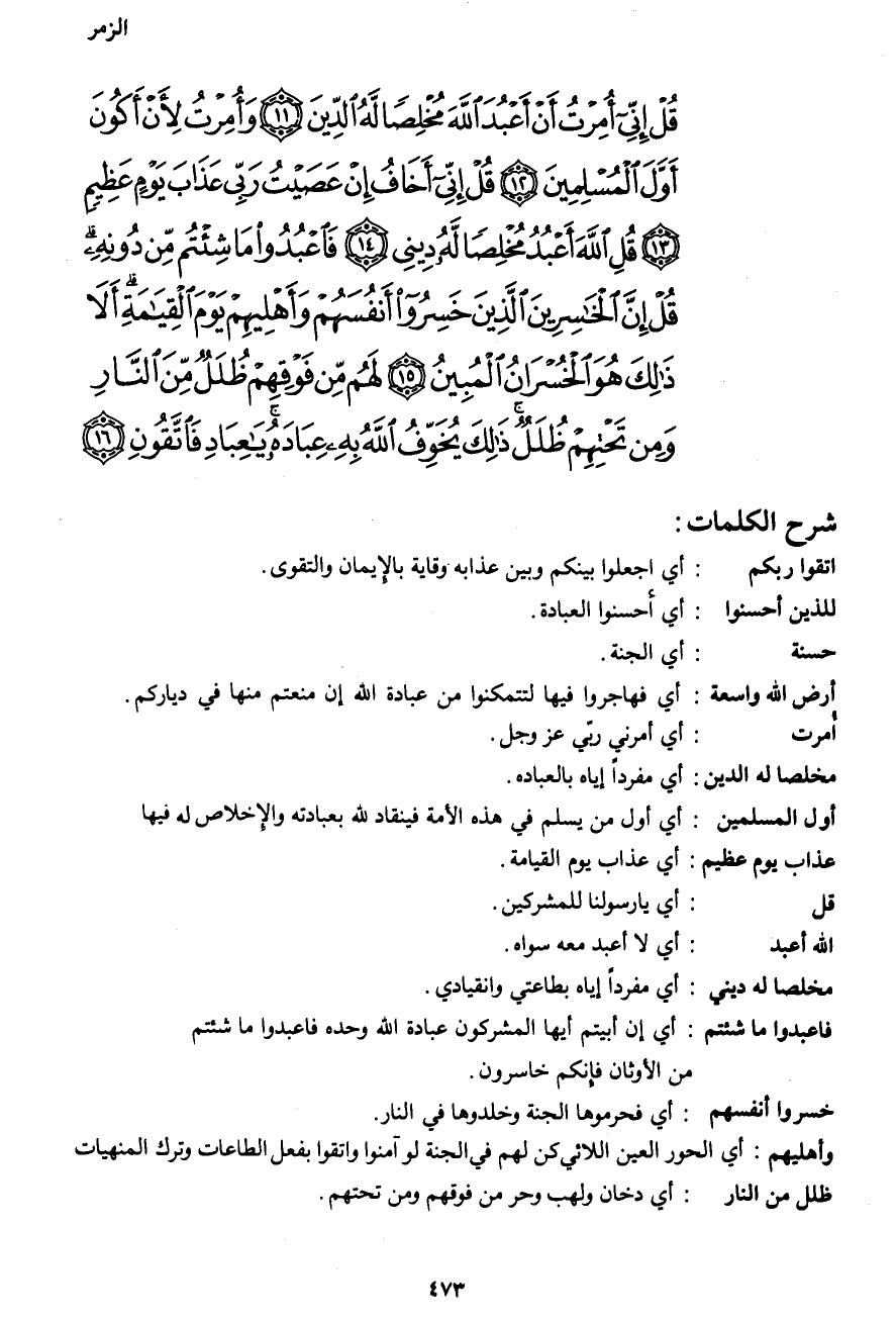قُلْ إِنِّي أُمِرْتُ أَنْ أَعْبُدَ اللهَ مُخْلِصاً لَهُ الدِّينَ (11) وَأُمِرْتُ لِأَنْ أَكُونَ أَوَّلَ الْمُسْلِمِينَ (12) قُلْ إِنِّي أَخَافُ إِنْ عَصَيْتُ رَبِّي عَذَابَ يَوْمٍ عَظِيمٍ (13) قُلِ اللهَ أَعْبُدُ مُخْلِصاً لَهُ دِينِي (14) فَاعْبُدُوا مَا شِئْتُمْ مِنْ دُونِهِ قُلْ إِنَّ الْخَاسِرِينَ الَّذِينَ خَسِرُوا أَنْفُسَهُمْ وَأَهْلِيهِمْ يَوْمَ الْقِيَامَةِ أَلا ذَلِكَ هُوَ الْخُسْرَانُ الْمُبِينُ (15) لَهُمْ مِنْ فَوْقِهِمْ ظُلَلٌ مِنَ النَّارِ وَمِنْ تَحْتِهِمْ ظُلَلٌ ذَلِكَ يُخَوِّفُ اللهُ بِهِ عِبَادَهُ يَا عِبَادِ فَاتَّقُونِ (16)