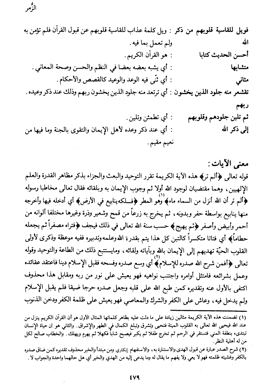 قوله تعالى {أَلَمْ تَرَ} هذه الآية الكريمة تقرر التوحيد والبعث والجزاء بذكر مظاهر القدرة والعلم الإلهيين، وهما مقتضيان لوجود الله أولاً ثم وجوب الإيمان به وبلقائه فقال تعالى مخاطباً رسوله {أَلَمْ تَرَ أَنَّ اللهَ أَنْزَلَ مِنَ السَّمَاءِ مَاءً} (1) وهو المطر {فَسَلَكَهُ يَنَابِيعَ فِي الْأَرْضِ} أي أدخله فيها وأخرجه منها ينابيع بواسطة حفر وبدونه، ثم يخرج به زرعاً من قمح وشعير وذرة وغيرها مختلفاً ألوانه من أحمر وأبيض وأصفر {ثُمَّ يَهِيجُ} حسب سنة الله تعالى في ذلك فيجف {فَتَرَاهُ مُصْفَرّاً ثُمَّ يَجْعَلُهُ حُطَاماً} أي فتاتا متكسراً كالتبن كل هذا يتم بقدرة الله وعلمه وتدبيره ففيه موعظة وذكرى لأولي القلوب الحيّة تهديهم إلى الإيمان بالله وبآياته ولقائه، وما يستتبع ذلك من الطاعة والتوحيد وقوله تعالى {أَفَمَنْ شَرَحَ اللهُ صَدْرَهُ لِلْإِسْلامِ} (2) أي وسع صدره وفسحه فقبل الإسلام ديناً فاعتقد عقائده وعمل بشرائعه فامتثل أوامره واجتنب نواهيه فهو يعيش على نور من ربه ومقابل هذا محذوف اكتفى بالأول عنه وتقديره كمن طبع الله على قلبه وجعل صدره حرجاً ضيقاً فلم يقبل الإسلام ولم يدخل فيه، وعاش على الكفر والشرك والمعاصي فهو يعيش على ظلمة الكفر ودخن الذنوب