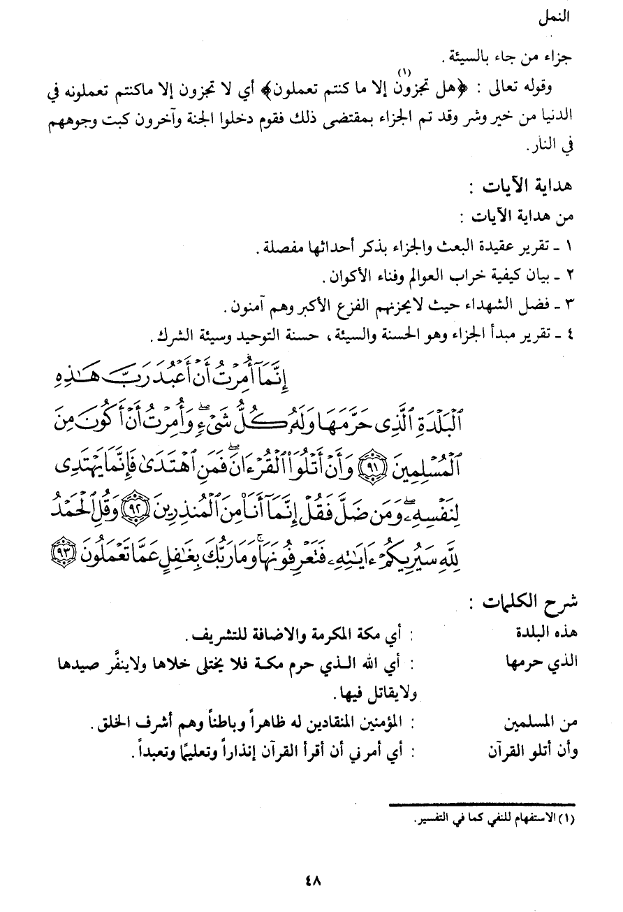 إِنَّمَا أُمِرْتُ أَنْ أَعْبُدَ رَبَّ هَذِهِ الْبَلْدَةِ الَّذِي حَرَّمَهَا وَلَهُ كُلُّ شَيْءٍ وَأُمِرْتُ أَنْ أَكُونَ مِنَ الْمُسْلِمِينَ (91) وَأَنْ أَتْلُوَ الْقُرْآنَ فَمَنِ اهْتَدَى فَإِنَّمَا يَهْتَدِي لِنَفْسِهِ وَمَنْ ضَلَّ فَقُلْ إِنَّمَا أَنَا مِنَ الْمُنْذِرِينَ (92) وَقُلِ الْحَمْدُ لِلَّهِ سَيُرِيكُمْ آيَاتِهِ فَتَعْرِفُونَهَا وَمَا رَبُّكَ بِغَافِلٍ عَمَّا تَعْمَلُونَ (93)