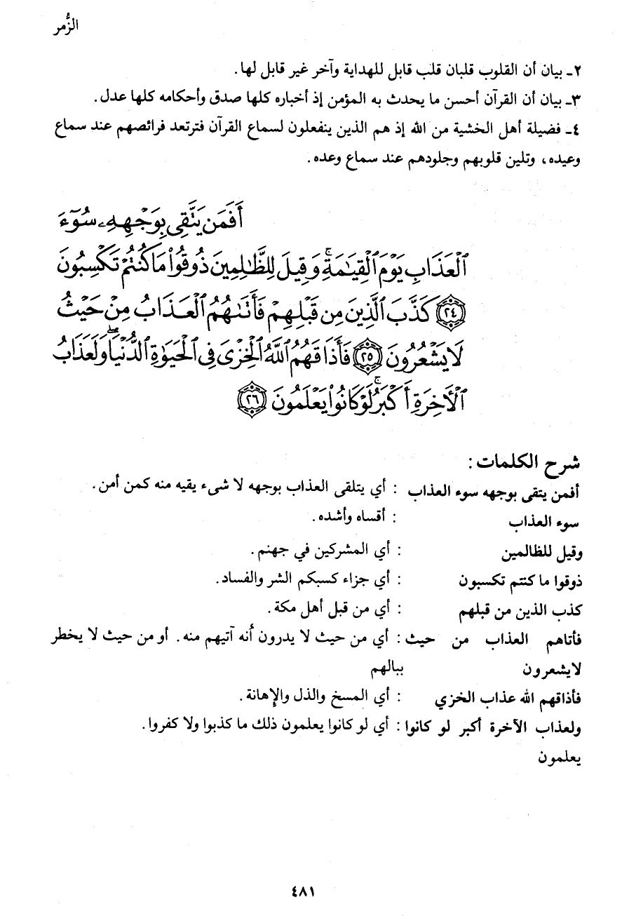 أَفَمَنْ يَتَّقِي بِوَجْهِهِ سُوءَ الْعَذَابِ يَوْمَ الْقِيَامَةِ وَقِيلَ لِلظَّالِمِينَ ذُوقُوا مَا كُنْتُمْ تَكْسِبُونَ (24) كَذَّبَ الَّذِينَ مِنْ قَبْلِهِمْ فَأَتَاهُمُ الْعَذَابُ مِنْ حَيْثُ لا يَشْعُرُونَ (25) فَأَذَاقَهُمُ اللهُ الْخِزْيَ فِي الْحَيَاةِ الدُّنْيَا وَلَعَذَابُ الْآخِرَةِ أَكْبَرُ لَوْ كَانُوا يَعْلَمُونَ (26)