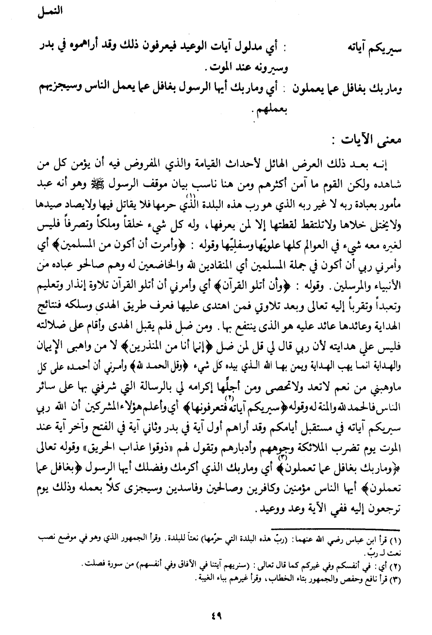 إنه بعد ذلك العرض الهائل لأحداث القيامة والذي المفروض فيه أن يؤمن كل من شاهده ولكن القوم ما آمن أكثرهم ومن هنا ناسب بيان موقف الرسول صَلَّى اللهُ عَلَيْهِ وَسَلَّمَ وهو أنه عبد مأمور بعبادة ربه لا غير، ربه الذي هو رب هذه البلدة الذي (1) حرمها فلا يقاتل فيها ولا يصاد صيدها ولا يختلى خلاها ولا تلتقط لقطتها إلا لمن يعرفها، وله كل شيء خلقاً وملكاً وتصرفاً فليس لغيره معه شيء في العوالم كلها علويّها وسلفيّها وقوله: {وَأُمِرْتُ أَنْ أَكُونَ مِنَ الْمُسْلِمِينَ} أي وأمرني ربي أكون في جملة المسلمين أي المنقادين لله والخاضعين له وهم صالحو عباده من الأنبياء والمرسيلين. وقوله: {وَأَنْ أَتْلُوَ الْقُرْآنَ} أي وأمرني أن أتلو القرآن تلاوةَ إنذارٍ وتعليم وتعبداً وتقرباً إليه تعالى وبعد تلاوتي فمن اهتدى عليها فعرف طريق الهدى وسلكه فنتائج الهداية وعائدها عائد عليه هو الذي ينتفع بها. ومن ضل فلم يقبل الهدى وأقام على ضلالته فليس علي هدايته لأن ربي قال لي قل لمن ضل {إِنَّمَا أَنَا مِنَ الْمُنْذِرِينَ} لا من واهبي الإيمان والهداية إنما يهب الهداية ويمن بها الله الذي بيده كل شيء {وَقُلِ الْحَمْدُ لِلَّهِ} وأمرني أن أحمده على كل ما وهبني من نعم لا تعد ولا تحصى ومن أجلِّها إكرامه لي بالرسالة التي شرفني بها على سائر الناس فالحمد لله والمنة له وقوله {سَيُرِيكُمْ آيَاتِه (2) ِ فَتَعْرِفُونَهَا} أي وأعلم هؤلاء المشركين أن الله ربي سيريكم آياته في مستقبل أيامكم وقد أراهم أول آية في بدر وثاني آية في الفتح وآخر آية عند الموت يوم تضرب الملائكة وجوههم وأدبارهم وتقول لهم "ذوقوا عذاب الحريق" وقوله تعالى {وَمَا رَبُّكَ بِغَافِلٍ عَمَّا تَعْمَلُونَ (3) } أي وما ربك الذي أكرمك وفضلك أيها الرسول {بغافل عما تعملون} أيها الناس مؤمنين وكافرين وصالحين وفاسدين وسيجزي كلاً بعمله وذلك يوم ترجعون إليه ففي الآية وعد ووعيد.