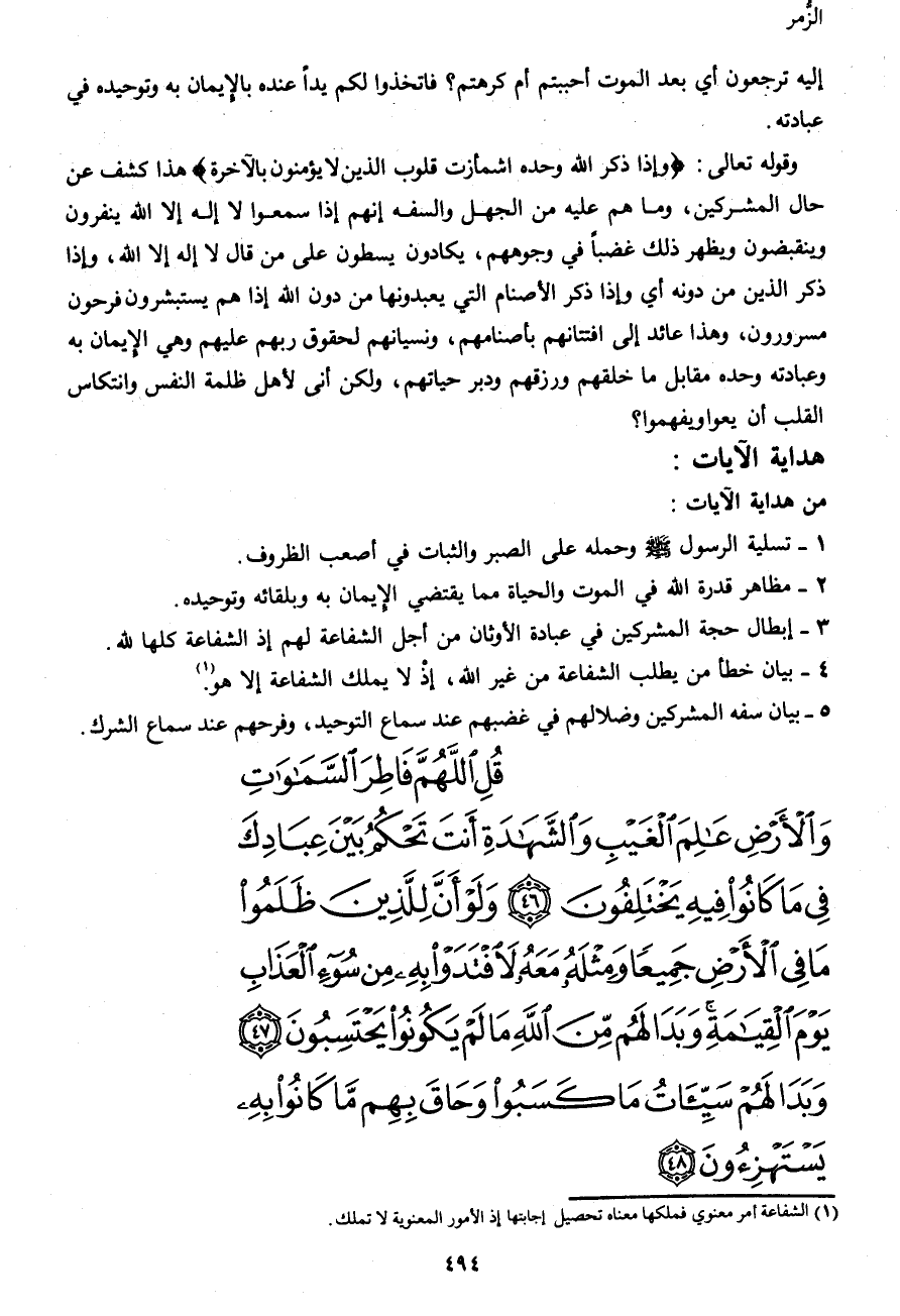 قُلِ اللهُمَّ فَاطِرَ السَّمَاوَاتِ وَالْأَرْضِ عَالِمَ الْغَيْبِ وَالشَّهَادَةِ أَنْتَ تَحْكُمُ بَيْنَ عِبَادِكَ فِي مَا كَانُوا فِيهِ يَخْتَلِفُونَ (46) وَلَوْ أَنَّ لِلَّذِينَ ظَلَمُوا مَا فِي الْأَرْضِ جَمِيعاً وَمِثْلَهُ مَعَهُ لافْتَدَوْا بِهِ مِنْ سُوءِ الْعَذَابِ يَوْمَ الْقِيَامَةِ وَبَدَا لَهُمْ مِنَ اللهِ مَا لَمْ يَكُونُوا يَحْتَسِبُونَ (47) وَبَدَا لَهُمْ سَيِّئَاتُ مَا كَسَبُوا وَحَاقَ بِهِمْ مَا كَانُوا بِهِ يَسْتَهْزِئُونَ (48)