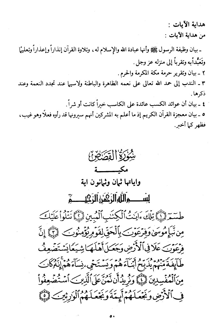 طسم (1) تِلْكَ آيَاتُ الْكِتَابِ الْمُبِينِ (2) نَتْلُو عَلَيْكَ مِنْ نَبَأِ مُوسَى وَفِرْعَوْنَ بِالْحَقِّ لِقَوْمٍ يُؤْمِنُونَ (3) إِنَّ فِرْعَوْنَ عَلا فِي الْأَرْضِ وَجَعَلَ أَهْلَهَا شِيَعاً يَسْتَضْعِفُ طَائِفَةً مِنْهُمْ يُذَبِّحُ أَبْنَاءَهُمْ وَيَسْتَحْيِي نِسَاءَهُمْ إِنَّهُ كَانَ مِنَ الْمُفْسِدِينَ (4) وَنُرِيدُ أَنْ نَمُنَّ عَلَى الَّذِينَ اسْتُضْعِفُوا فِي الْأَرْضِ وَنَجْعَلَهُمْ أَئِمَّةً وَنَجْعَلَهُمُ الْوَارِثِينَ (5)