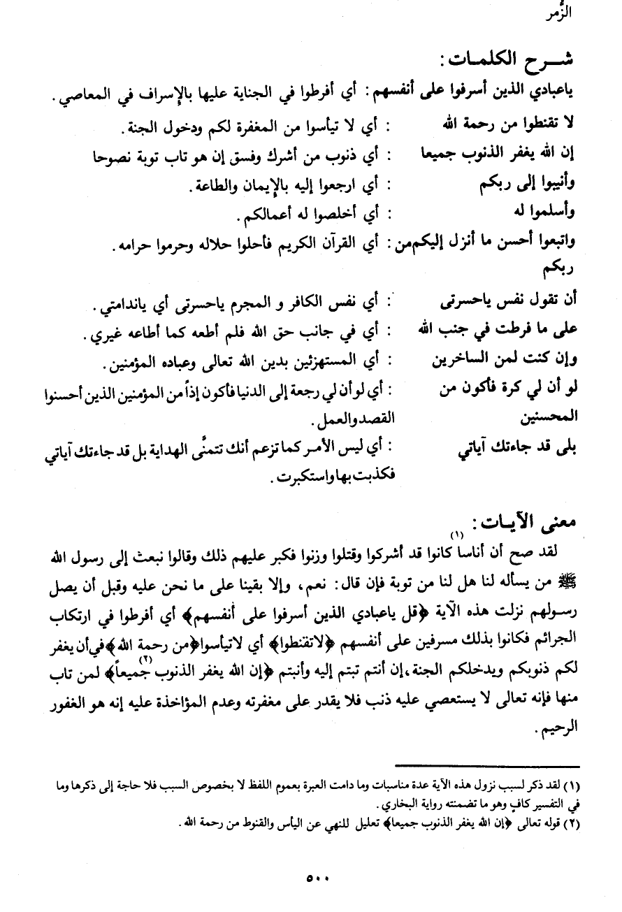 لقد صح أن أناسا (1) كانوا قد أشركوا وقتلوا وزنوا فكبر عليهم ذلك وقالوا نبعث إلى رسول الله صَلَّى اللهُ عَلَيْهِ وَسَلَّمَ من يسأله لنا هل لنا من توبة فإن قال: نعم، وإلا بقينا على ما نحن عليه وقبل أن يصل رسولهم نزلت هذه الآية {قُلْ يَا عِبَادِيَ الَّذِينَ أَسْرَفُوا عَلَى أَنْفُسِهِمْ} أي أفرطوا في ارتكاب الجرائم فكانوا بذلك مسرفين على أنفسهم {لا تَقْنَطُوا} أي لا تيأسوا {مِنْ رَحْمَةِ} في أن يغفر لكم ذنوبكم ويدخلكم الجنة، إن أنتم تبتم إليه وأنبتم {إِنَّ اللهَ يَغْفِرُ الذُّنُوبَ (2) جَمِيعاً} لمن تاب منها فإنه تعالى لا يستعصي عليه ذنب فلا يقدر على مغفرته وعدم المؤاخذة عليه إنه هو الغفور الرحيم.