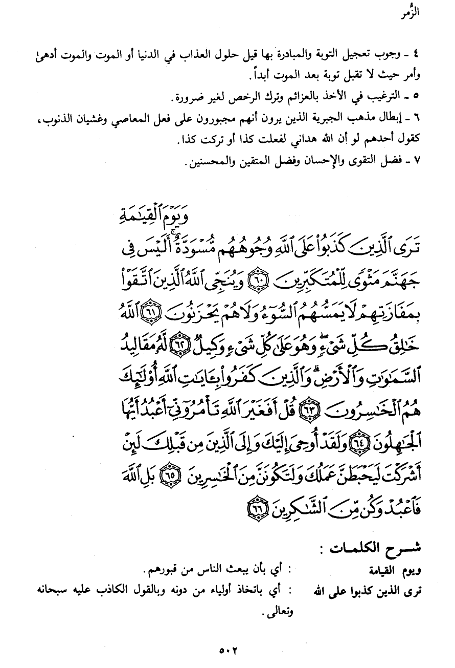 وَيَوْمَ الْقِيَامَةِ تَرَى الَّذِينَ كَذَبُوا عَلَى اللهِ وُجُوهُهُمْ مُسْوَدَّةٌ أَلَيْسَ فِي جَهَنَّمَ مَثْوىً لِلْمُتَكَبِّرِينَ (60) وَيُنَجِّي اللهُ الَّذِينَ اتَّقَوْا بِمَفَازَتِهِمْ لا يَمَسُّهُمُ السُّوءُ وَلا هُمْ يَحْزَنُونَ (61) اللهُ خَالِقُ كُلِّ شَيْءٍ وَهُوَ عَلَى كُلِّ شَيْءٍ وَكِيلٌ (62) لَهُ مَقَالِيدُ السَّمَاوَاتِ وَالْأَرْضِ وَالَّذِينَ كَفَرُوا بِآياتِ اللهِ أُولَئِكَ هُمُ الْخَاسِرُونَ (63) قُلْ أَفَغَيْرَ اللهِ تَأْمُرُونِّي أَعْبُدُ أَيُّهَا الْجَاهِلُونَ (64) وَلَقَدْ أُوحِيَ إِلَيْكَ وَإِلَى الَّذِينَ مِنْ قَبْلِكَ لَئِنْ أَشْرَكْتَ لَيَحْبَطَنَّ عَمَلُكَ وَلَتَكُونَنَّ مِنَ الْخَاسِرِينَ (65) بَلِ اللهَ فَاعْبُدْ وَكُنْ مِنَ الشَّاكِرِينَ (66)