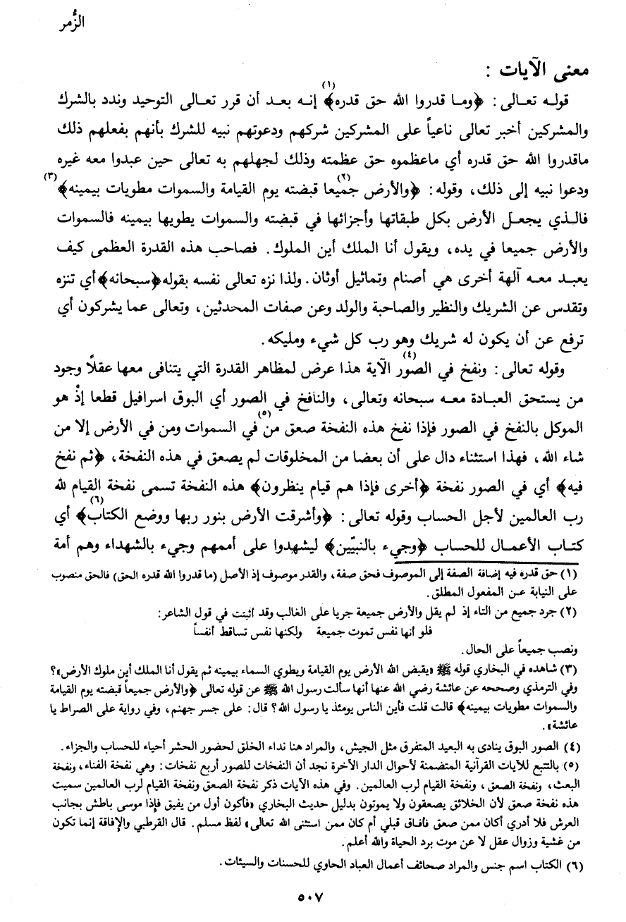 وقوله تعالى: {وَنُفِخَ فِي الصُّورِ (4) } الآية هذا عرض لمظاهر القدرة التي يتنافى معها عقلاً وجود من يستحق العبادة معه سبحانه وتعالى، والنافخ في الصور أي البوق إسرافيل قطعاً إذ هو الموكل بالنفخ في الصور فإذا نفخ هذه النفخة صعق من (5) في السموات ومن في الأرض إلا من شاء الله، فهذا استثناء دال على أن بعضاً من المخلوقات لم يصعق في هذه النفخة، {ثُمَّ نُفِخَ فِيهِ} أي في الصور نفخة {أُخْرَى فَإِذَا هُمْ قِيَامٌ يَنْظُرُونَ} هذه النفخة تسمى نفخة القيام لله رب العالمين لأجل الحساب وقوله تعالى: {وَأَشْرَقَتِ الْأَرْضُ بِنُورِ رَبِّهَا وَوُضِعَ الْكِتَابُ (6) } أي كتاب الأعمال للحساب {وَجِيءَ بِالنَّبِيِّينَ} ليشهدوا على أممهم وجيء بالشهداء وهم أمة