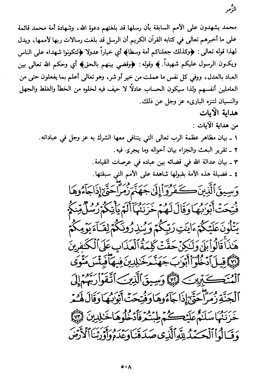 وَسِيقَ الَّذِينَ كَفَرُوا إِلَى جَهَنَّمَ زُمَراً حَتَّى إِذَا جَاءُوهَا فُتِحَتْ أَبْوَابُهَا وَقَالَ لَهُمْ خَزَنَتُهَا أَلَمْ يَأْتِكُمْ رُسُلٌ مِنْكُمْ يَتْلُونَ عَلَيْكُمْ آيَاتِ رَبِّكُمْ وَيُنْذِرُونَكُمْ لِقَاءَ يَوْمِكُمْ هَذَا قَالُوا بَلَى وَلَكِنْ حَقَّتْ كَلِمَةُ الْعَذَابِ عَلَى الْكَافِرِينَ (71) قِيلَ ادْخُلُوا أَبْوَابَ جَهَنَّمَ خَالِدِينَ فِيهَا فَبِئْسَ مَثْوَى الْمُتَكَبِّرِينَ (72) وَسِيقَ الَّذِينَ اتَّقَوْا رَبَّهُمْ إِلَى الْجَنَّةِ زُمَراً حَتَّى إِذَا جَاءُوهَا وَفُتِحَتْ أَبْوَابُهَا وَقَالَ لَهُمْ خَزَنَتُهَا سَلامٌ عَلَيْكُمْ طِبْتُمْ فَادْخُلُوهَا خَالِدِينَ (73) وَقَالُوا الْحَمْدُ لِلَّهِ الَّذِي صَدَقَنَا وَعْدَهُ وَأَوْرَثَنَا الْأَرْضَ