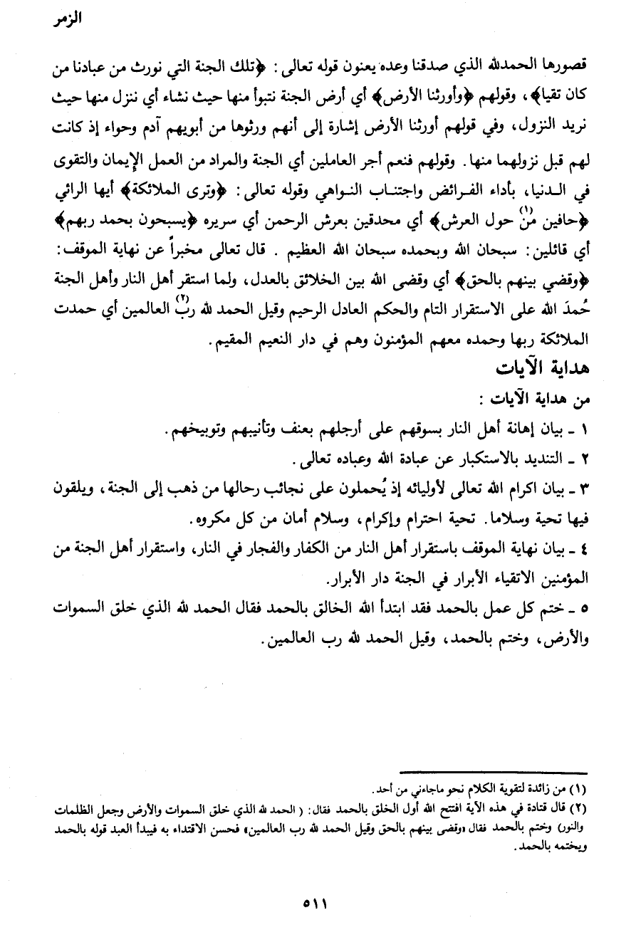 قصورها الحمد لله الذي صدقنا وعده يعنون قوله تعالى: {تِلْكَ الْجَنَّةُ الَّتِي نُورِثُ مِنْ عِبَادِنَا مَنْ كَانَ تَقِيّاً} ، وقوله: {وَأَوْرَثَنَا الْأَرْضَ} أي أرض الجنة نتبوأ منها حيث نشاء أي ننزل منها حيث نريد النزول، وفي قولهم أورثنا الأرض إشارة إلى أنهم ورثوها من أبويهم آدم وحواء إذ كانت لهم قبل نزولهما منها. وقولهم فنعم أجر العاملين أي الجنة والمراد من العمل الإيمان والتقوى في الدنيا، بأداء الفرائض واجتناب النواهي وقوله تعالى: {وَتَرَى الْمَلائِكَةَ} أيها الرائي {حَافِّينَ مِنْ (1) حَوْلِ الْعَرْشِ} أي محدقين بعرش الرحمن أي سريره {يُسَبِّحُونَ بِحَمْدِ رَبِّهِمْ} أي قائلين: سبحان الله وبحمده سبحان الله العظيم. قال تعالى مخبرا عن نهاية الموقف: {وَقُضِيَ بَيْنَهُمْ بِالْحَقِّ} أي وقضى الله بين الخلائق بالعدل، ولما استقر أهل النار وأهل الجنة حُمد الله على الاستقرار التام والحكم العادل الرحيم وقيل الحمد لله رب (2) العالمين أي حمدت الملائكة ربها وحمده معهم المؤمنون وهم في دار النعيم المقيم.