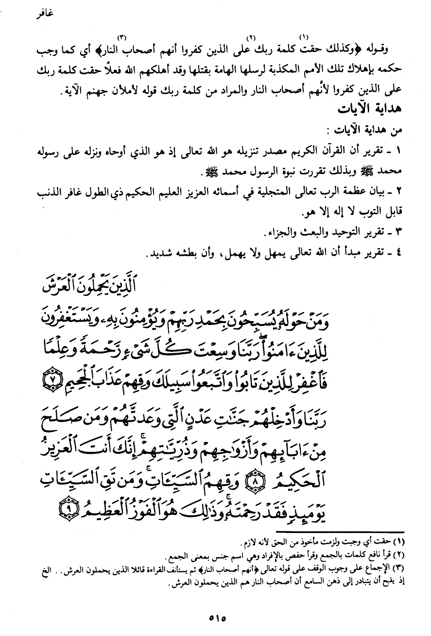 الَّذِينَ يَحْمِلُونَ الْعَرْشَ وَمَنْ حَوْلَهُ يُسَبِّحُونَ بِحَمْدِ رَبِّهِمْ وَيُؤْمِنُونَ بِهِ وَيَسْتَغْفِرُونَ لِلَّذِينَ آمَنُوا رَبَّنَا وَسِعْتَ كُلَّ شَيْءٍ رَحْمَةً وَعِلْماً فَاغْفِرْ لِلَّذِينَ تَابُوا وَاتَّبَعُوا سَبِيلَكَ وَقِهِمْ عَذَابَ الْجَحِيمِ (7) رَبَّنَا وَأَدْخِلْهُمْ جَنَّاتِ عَدْنٍ الَّتِي وَعَدْتَهُمْ وَمَنْ صَلَحَ مِنْ آبَائِهِمْ وَأَزْوَاجِهِمْ وَذُرِّيَّاتِهِمْ إِنَّكَ أَنْتَ الْعَزِيزُ الْحَكِيمُ (8) وَقِهِمُ السَّيِّئَاتِ وَمَنْ تَقِ السَّيِّئَاتِ يَوْمَئِذٍ فَقَدْ رَحِمْتَهُ وَذَلِكَ هُوَ الْفَوْزُ الْعَظِيمُ (9)