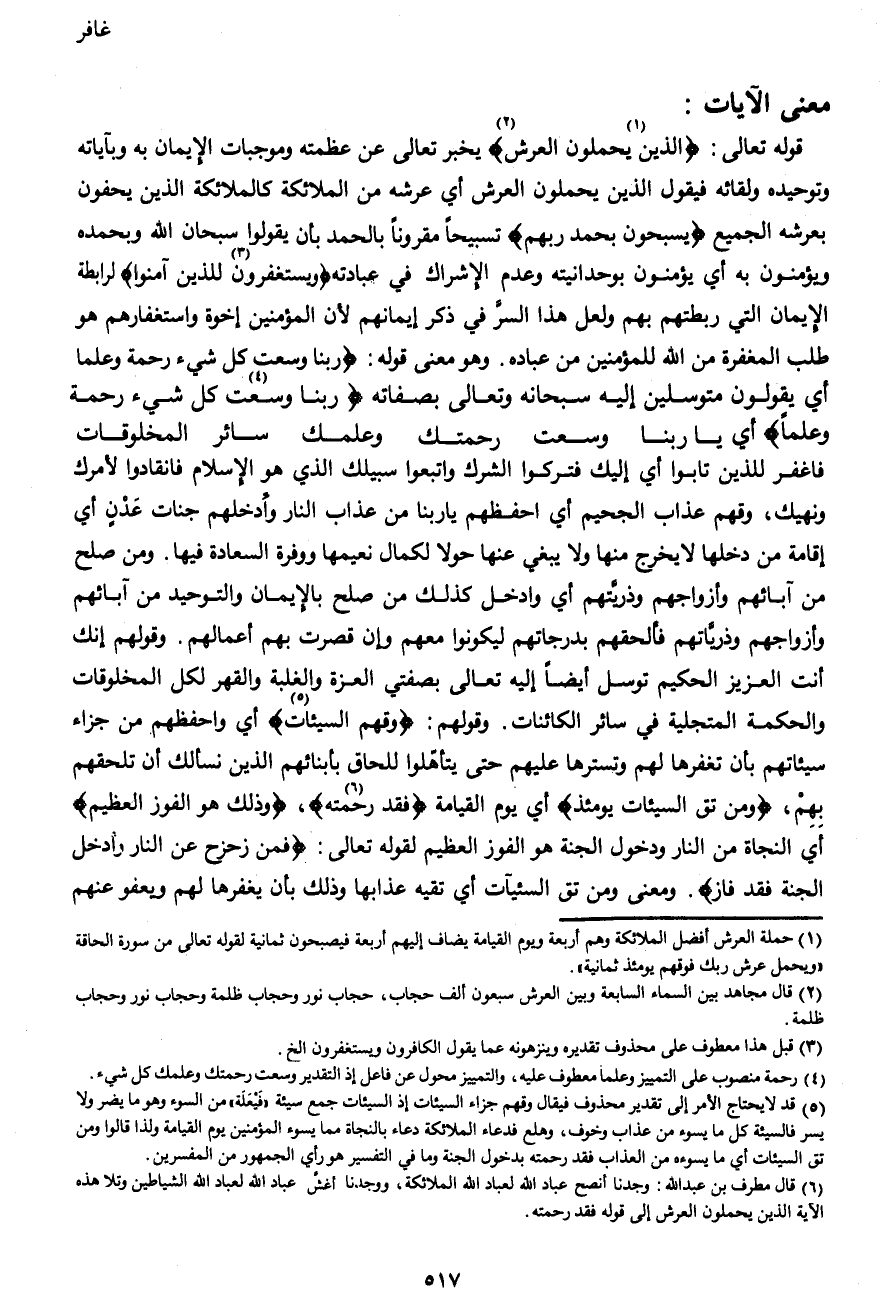 قوله تعالى: {الَّذِينَ (1) يَحْمِلُونَ الْعَرْشَ (2) } يخبر تعالى عن عظمته وموجبات الإيمان به وبآياته وتوحيده ولقائه فيقول الذين يحملون العرش أي عرشه من الملائكة كالملائكة الذين يحفون بعرشه الجميع {يُسَبِّحُونَ بِحَمْدِ رَبِّهِمْ} تسبيحاً مقروناً بالحمد بأن يقولوا سبحان الله وبحمده ويؤمنون به أي يؤمنون بوحدانيته وعدم الإشراك في عبادته {وَيَسْتَغْفِرُونَ (3) لِلَّذِينَ آمَنُوا} لرابطة الإيمان التي تربطهم بهم ولعل هذا السرّ في ذكر إيمانهم لأن المؤمنين إخوة واستغفارهم هو طلب المغفرة من الله للمؤمنين من عباده. وهو معنى قوله: {رَبَّنَا وَسِعْتَ كُلَّ شَيْءٍ رَحْمَةً وَعِلْماً} أي يقولون متوسلين إليه بصفاته {رَبَّنَا وَسِعْتَ (4) كُلَّ شَيْءٍ رَحْمَةً وَعِلْماً} أي يا ربنا وسعت رحمتك وعلمك سائر المخلوقات فاغفر للذين تابوا أي إليك فتركوا الشرك واتبعوا سبيلك الذي هو الإسلام فانقادوا لأمرك ونهيك، وقهم عذاب الجحيم أي احفظهم يا ربنا من عذاب النار وأدخلهم جنات عدن أي إقامة من دخلها لا يخرج منها ولا يبغي عنها حولا لكمال نعيمها ووفرة السعادة فيها. ومن صلح من آبائهم وأزواجهم وذريّتهم أي وأدخل كذلك من صلح بالإيمان والتوحيد من آبائهم وأزواجهم وذريّاتهم فألحقهم بدرجاتهم ليكونوا معهم وإن قصرت بهم أعمالهم. وقولهم إنك أنت العزيز الحكيم توسل أيضاً إليه تعالى بصفتي العزة والغلبة والقهر لكل المخلوقات والحكمة المتجلية في سائر الكائنات. وقولهم: {وَقِهِمُ السَّيِّئَاتِ (5) } أي واحفظهم من جزاء سيئاتهم بأن تغفرها لهم وتسترها عليهم حتى يتأهلوا للحاق بأبنائهم الذين نسألك أن تلحقهم بهم، {وَمَنْ تَقِ السَّيِّئَاتِ يَوْمَئِذٍ} أي يوم القيامة {فَقَدْ رَحِمْتَهُ (6) } ، {وَذَلِكَ هُوَ الْفَوْزُ الْعَظِيمُ} أي النجاة من النار ودخول الجنة هو الفوز العظيم لقوله تعالى {فَمَنْ زُحْزِحَ عَنِ النَّارِ وَأُدْخِلَ الْجَنَّةَ فَقَدْ فَازَ} . ومعنى ومن تق السيئات أي تقيه عذابها وذلك بأن يغفرها لهم ويعفو عنهم