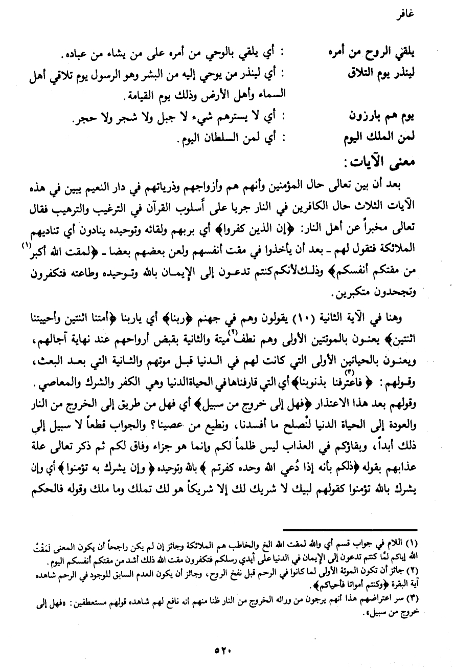 وهنا في الآية الثانية (10) يقولون وهم في جهنم {رَبَّنَا} أي يا ربنا {أَمَتَّنَا اثْنَتَيْنِ وَأَحْيَيْتَنَا اثْنَتَيْنِ} يعنون بالموتتين الأولى وهم نطف (2) ميتة والثانية بقبض أرواحهم عند نهاية آجالهم، ويعنون بالحياتين الأولى التي كانت لهم في الدنيا قبل موتهم والثانية التي بعد البعث، وقولهم: {فَاعْتَرَفْنَا (3) بِذُنُوبِنَا} أي التي قارفناها في الحياة الدنيا وهي الكفر والشرك والمعاصي. وقولهم بعد هذا الاعتذار {فَهَلْ إِلَى خُرُوجٍ مِنْ سَبِيلٍ} أي فهل من طريق إلى الخروج من النار والعودة إلى الحياة الدنيا لنصلح ما أفسدنا، ونطيع من عصينا؟ والجواب قطعاً لا سبيل إلى ذلك أبداً، وبقاؤكم وفي العذاب ليس ظلماً لكم وإنما هو جزاء وفاق لكم ثم ذكر تعالى علة عذابهم بقوله {ذَلِكُمْ بِأَنَّهُ إِذَا دُعِيَ اللهُ وَحْدَهُ كَفَرْتُمْ} بالله وتوحيد {وَإِنْ يُشْرَكْ بِهِ تُؤْمِنُوا} أي وإن يشرك بالله تؤمنوا كقولهم لبيك لا شريك لك إلا شريكاً هو لك تملك وما ملك وقوله فالحكم