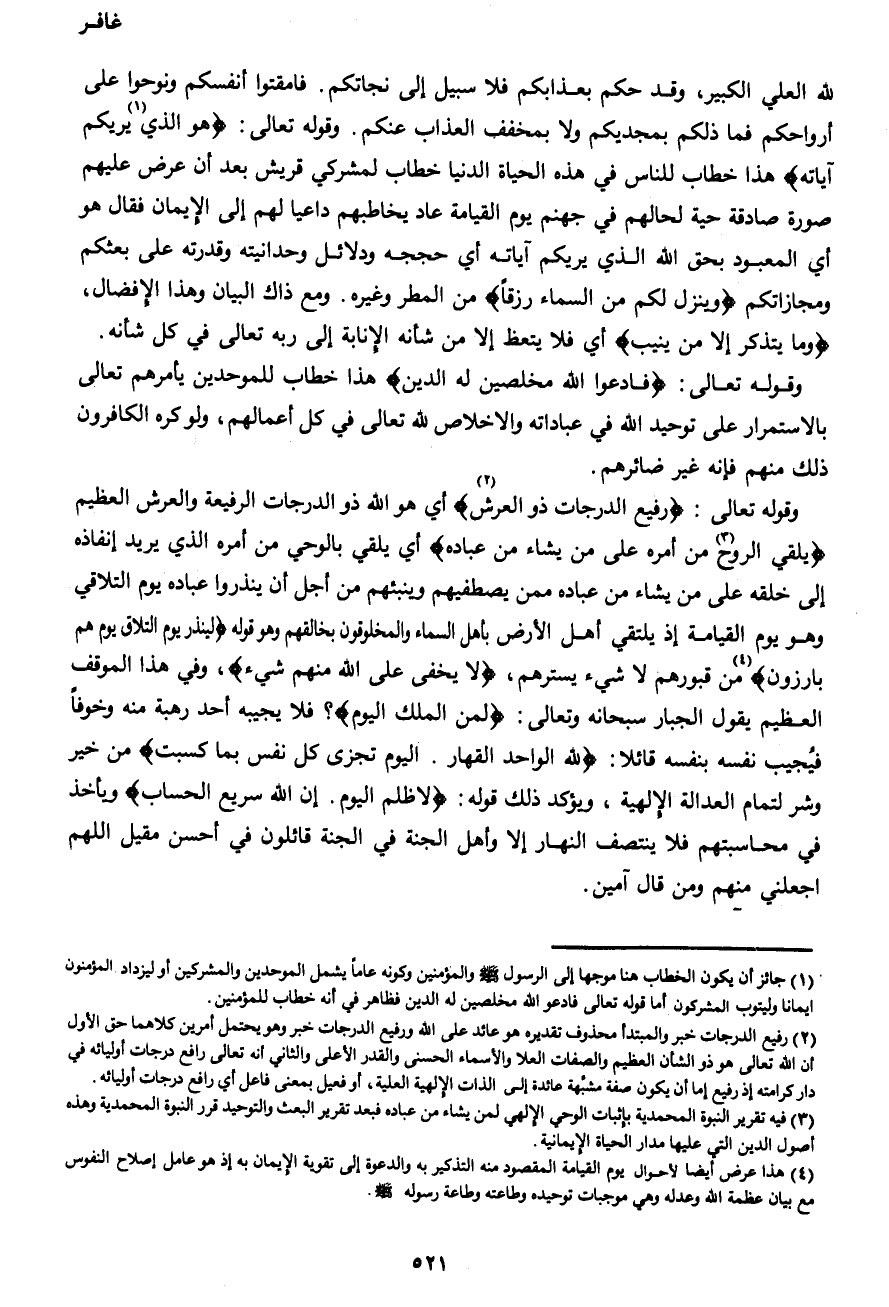 وقوله تعالى: {رَفِيعُ الدَّرَجَاتِ ذُو الْعَرْشِ (2) } أي هو الله ذو الدرجات الرفيعة والعرش العظيم {يُلْقِي الرُّوحَ (3) مِنْ أَمْرِهِ عَلَى مَنْ يَشَاءُ مِنْ عِبَادِهِ} أي يلقي بالوحي من أمره الذي يريد إنفاذه إلى خلقه على من يشاء من عباده ممن يصطفيهم وينبئهم من أجل أن ينذروا عباده يوم التلاقي وهو يوم القيامة إذ يلتقي أهل الأرض بأهل السماء والمخلوقون بخالقهم وهو قوله {لِيُنْذِرَ يَوْمَ التَّلاقِ يَوْمَ هُمْ بَارِزُونَ} (4) من قبورهم لا شيء يسترهم، {لا يَخْفَى عَلَى اللهِ مِنْهُمْ شَيْءٌ} ، وفي هذا الموقف العظيم يقول الجبار سبحانه وتعالى: {لِمَنِ الْمُلْكُ الْيَوْمَ} ؟ فلا يجيبه أحد رهبة منه وخوفاً فيجيب نفسه بنفسه قائلاً: {لِلَّهِ الْوَاحِدِ الْقَهَّارِ. الْيَوْمَ تُجْزَى كُلُّ نَفْسٍ بِمَا كَسَبَتْ} من خير وشر لتمام العدالة الإلهية، ويؤكد ذلك قوله: {لا ظُلْمَ الْيَوْمَ إِنَّ اللهَ سَرِيعُ الْحِسَابِ} ويأخذ في محاسبتهم فلا ينتصف النهار إلا وأهل الجنة في الجنة قائلون في أحسن مقيل اللهم اجعلني منهم ومن قال آمين.