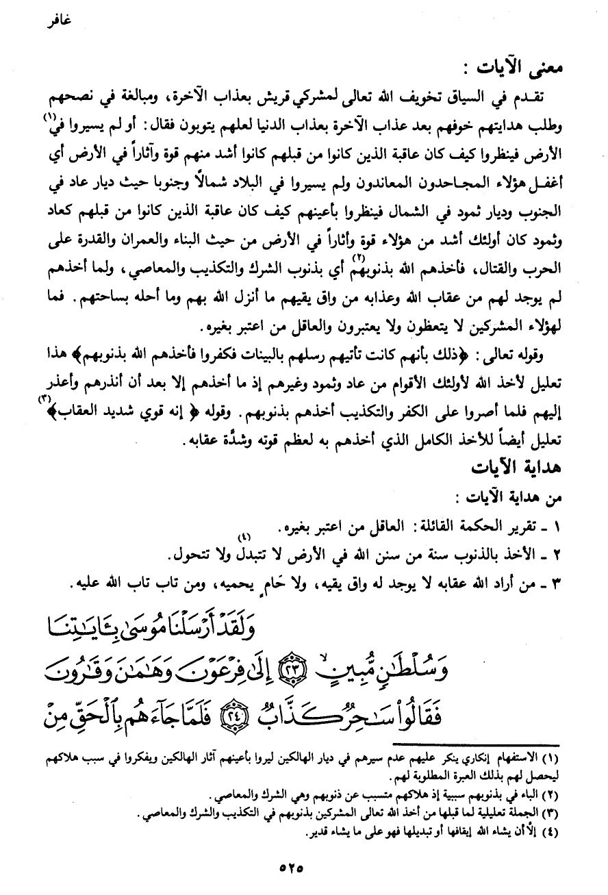 تقدم في السياق تخويف الله تعالى لمشركي قريش بعذاب الآخرة، ومبالغة في نصحهم وطلب هدايتهم خوفهم بعد عذاب الآخرة بعذاب الدنيا لعلهم يتوبون فقال: {أَوَلَمْ يَسِيرُوا فِي (1) الْأَرْضِ فَيَنْظُرُوا كَيْفَ كَانَ عَاقِبَةُ الَّذِينَ كَانُوا مِنْ قَبْلِهِمْ كَانُوا هُمْ أَشَدَّ مِنْهُمْ قُوَّةً وَآثَاراً فِي الْأَرْضِ} أي أغفل هؤلاء المجاحدون المعاندون ولم يسيروا في البلاد شمالاً وجنوباً حيث ديار عاد في الجنوب وديار ثمود في الشمال فينظروا بأعينهم كيف كان عاقبة الذين كانوا من قبلهم كعاد وثمود كان أولئك أشد من هؤلاء قوة وأثاراً في الأرض من حيث البناء والعمران والقدرة على الحرب والقتال، فأخذهم الله بذنوبهم (2) أي بذنوب الشرك والتكذيب والمعاصي، ولما أخذهم لم يوجد لهم من عقاب الله وعذابه من واق يقيهم ما أنزل الله بهم وما أحله بساحتهم. فما لهؤلاء المشركين لا يتعظون ولا يعتبرون والعاقل من اعتبر بغيره.