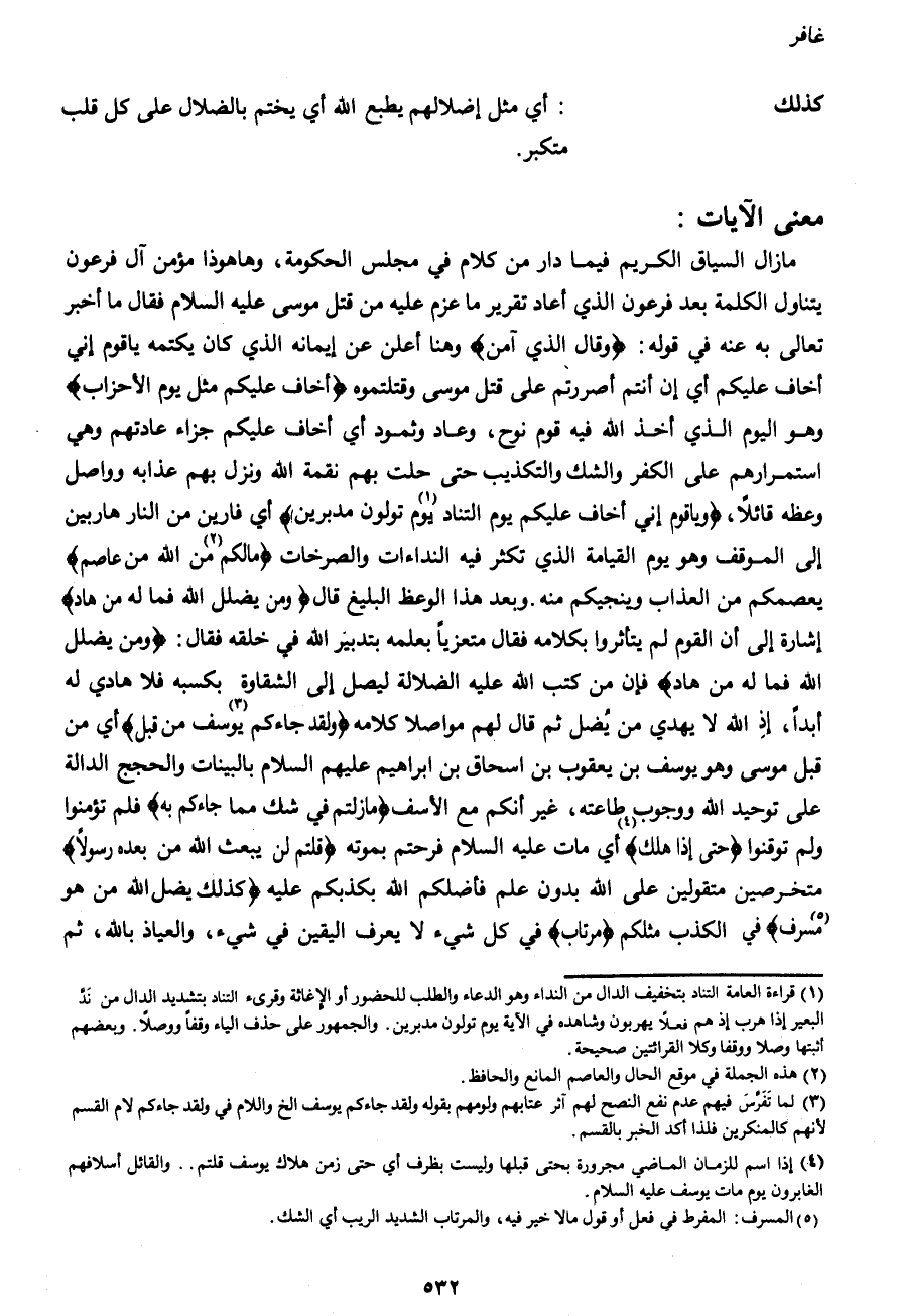 ما زال السياق الكريم فيما دار من كلام في مجلس الحكومة، وها هو ذا مؤمن آل فرعون يتناول الكلمة بعد فرعون الذي أعاد تقريراً ما عزم عليه من قتل موسى عليه السلام فقال ما أخبر تعالى به عنه في قوله: {وَقَالَ الَّذِي آمَنَ} وهنا أعلن عن إيمانه الذي كان يكتمه يا قوم إني أخاف عليكم أي إن أنتم أصررتم على قتل موسى وقتلتموه {أَخَافُ عَلَيْكُمْ مِثْلَ يَوْمِ الْأَحْزَابِ} وهو اليوم الذي أخذ الله فيه قوم نوح، وعاد وثمود أي أخاف عليكم جزاء عادتهم وهي استمرارهم على الكفر والشك والتكذيب حتى حلت بهم نقمة الله ونزل بهم عذابه وواصل وعظه قائلاً، {وَيَا قَوْمِ إِنِّي أَخَافُ عَلَيْكُمْ يَوْمَ التَّنَادِ (1) يَوْمَ تُوَلُّونَ مُدْبِرِينَ} أي فارين من النار هاربين إلى الموقف وهو يوم القيامة الذي تكثر فيه النداءات والصرخات {مَا لَكُمْ (2) مِنَ اللهِ مِنْ عَاصِمٍ} يعصمكم من العذاب وينجيكم منه. وبعد هذا الوعظ البليغ قال {وَمَنْ يُضْلِلِ اللهُ فَمَا لَهُ مِنْ هَادٍ} إشارة إلى أن القوم لم يتأثروا بكلامه فقال متعزياً بعلمه بتدبير الله في خلقه فقال: {وَمَنْ يُضْلِلِ اللهُ فَمَا لَهُ مِنْ هَادٍ} فإن من كتب الله عليه الضلال ليصل إلى الشقاوة بكسبه فلا هادي له أبداً، إذ الله لا يهدي من يُضل ثم قال لهم مواصلاً كلامه {وَلَقَدْ جَاءَكُمْ (3) يُوسُفُ مِنْ قَبْلُ} أي من قبل موسى وهو يوسف بن يعقوب بن إسحاق بن إبراهيم عليهم السلام بالبينات والحجج الدالة على توحيد الله ووجوب طاعته، غير أنكم مع الأسف {مَا زِلْتُمْ فِي شَكٍّ مِمَّا جَاءَكُمْ بِهِ} فلم تؤمنوا ولم توقنوا {حَتَّى إِذَا هَلَكَ (4) } أي مات عليه السلام فرحتم بموته {قُلْتُمْ لَنْ يَبْعَثَ اللهُ مِنْ بَعْدِهِ رَسُولاً} متخرصين متقولين على الله بدون علم فأضلكم الله بكذبكم عليه {كَذَلِكَ يُضِلُّ اللهُ مَنْ هُوَ مُسْرِفٌ (5) } في الكذب مثلكم {مُرْتَابٌ} في كل شيء لا يعرف اليقين في شيء، والعياذ بالله، ثم