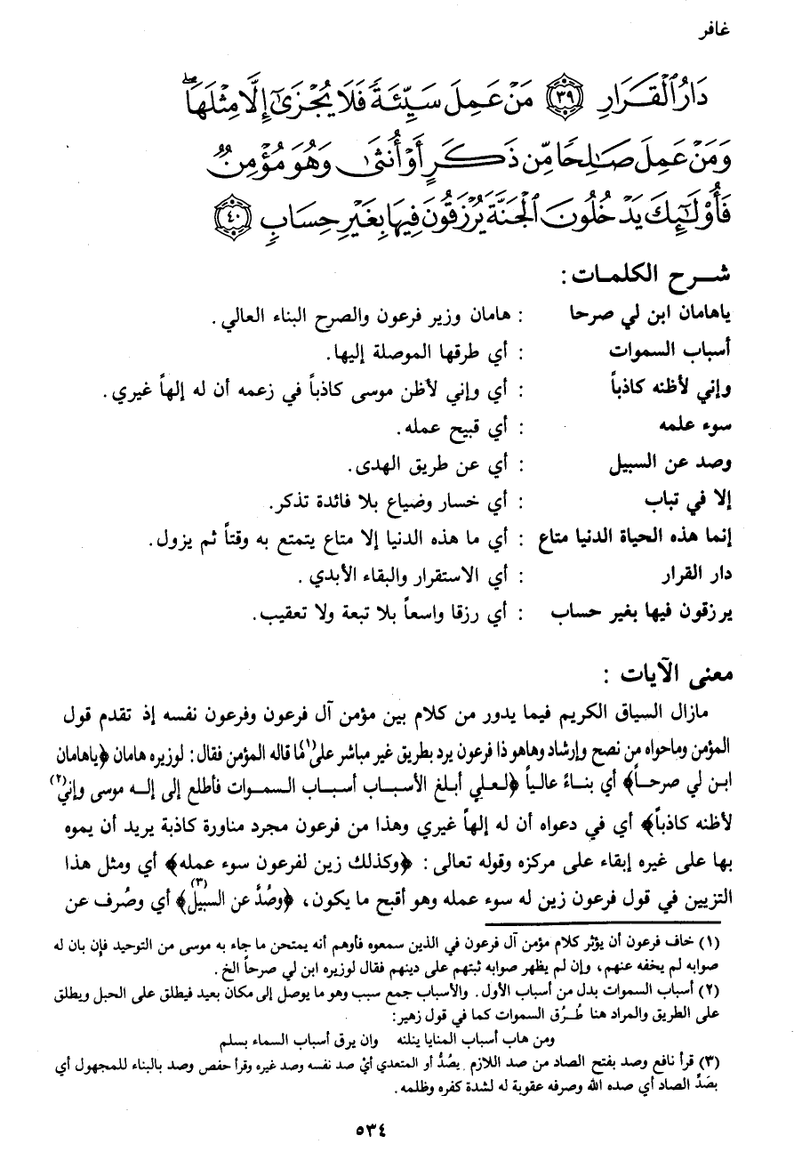 ما زال السياق الكريم فيما يدور من كلام بين مؤمن آل فرعون وفرعون نفسه إذ تقدم قول المؤمن وما حواه من نصح وإرشاد وها هو ذا فرعون يرد بطريق غير مباشر على (1) ما قاله المؤمن فقال: لوزيره هامان {يَا هَامَانُ ابْنِ لِي صَرْحاً} أي بناء عالياً {لَعَلِّي أَبْلُغُ الْأَسْبَابَ أَسْبَابَ السَّمَاوَاتِ فَأَطَّلِعَ إِلَى إِلَهِ مُوسَى وَإِنِّي (2) لَأَظُنُّهُ كَاذِباً} أي في دعواه أن له إلها غيري وهذا من فرعون مجرد مناورة كاذبة يريد أن يموه بها على غيره إبقاء على مركزه وقوله تعالى: {وَكَذَلِكَ زُيِّنَ لِفِرْعَوْنَ سُوءُ عَمَلِهِ} أي ومثل هذا التزيين في قول فرعون زين له سوء عمله وهو أقبح ما يكون، {وَصُدَّ عَنِ السَّبِيلِ (3) } أي صرف عن