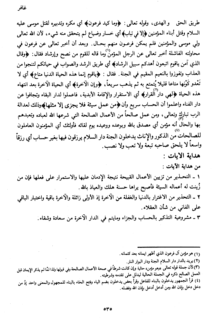طريق الحق والهدى، وقوله تعالى: {وَمَا كَيْدُ فِرْعَوْنَ} أي مكره وتدبيره لقتل موسى عليه السلام وقتل أبناء المؤمنين {إِلَّا فِي تَبَابٍ} أي خسار وضياع لم يتحقق منه شيء، لأن الله تعالى ولي موسى والمؤمنين فلم يمكن فرعون منهم بحال. وبعد أن أخبر تعالى عن فرعون في محاولته الفاشلة أخبر تعالى عن الرجل المؤمن (1) وما قاله للقوم من نصح وإرشاد فقال: {وَقَالَ الَّذِي آمَنَ يَا قَوْمِ اتَّبِعُونِ أَهْدِكُمْ سَبِيلَ الرَّشَادِ} أي طريق الرشد والصواب في حياتكم لتنجوا من العذاب وتفوزوا بالنعيم المقيم في الجنة. فقال: {يَا قَوْمِ إِنَّمَا هَذِهِ الْحَيَاةُ الدُّنْيَا مَتَاعٌ} أي لا تعدو كونها متاعاً قليلاً يُتمتع به ثم يذهب سريعا، {وَإِنَّ الْآخِرَةَ} أي الحياة الآخرة بعد انتهاء هذه الحياة {هِيَ دَارُ (2) الْقَرَارِ} أي الاستقرار والإقامة الأبدية، فاعملوا لدار البقاء وتجافوا عن دار الفناء واعلموا أن الحساب سريع وأن {مَنْ عَمِلَ سَيِّئَةً فَلا يُجْزَى إِلَّا مِثْلَهَا} وذل لعدالة الرب تبارك وتعالى، ومن عمل صالحاً من الأعمال الصالحة التي شرعها الله لعباده وتعبدهم بها والحال (3) أنه مؤمن أي مصدق بالله وبوعده ووعيده يوم لقائه فأولئك أي المؤمنون العاملون للصالحات (4) من الذكور والإناث يدخلون الجنة دار السلام يرزقون فيها بغير حساب أي رزقاً واسعاً لا يلحق صاحبه تبعة ولا تعب ولا نصب.