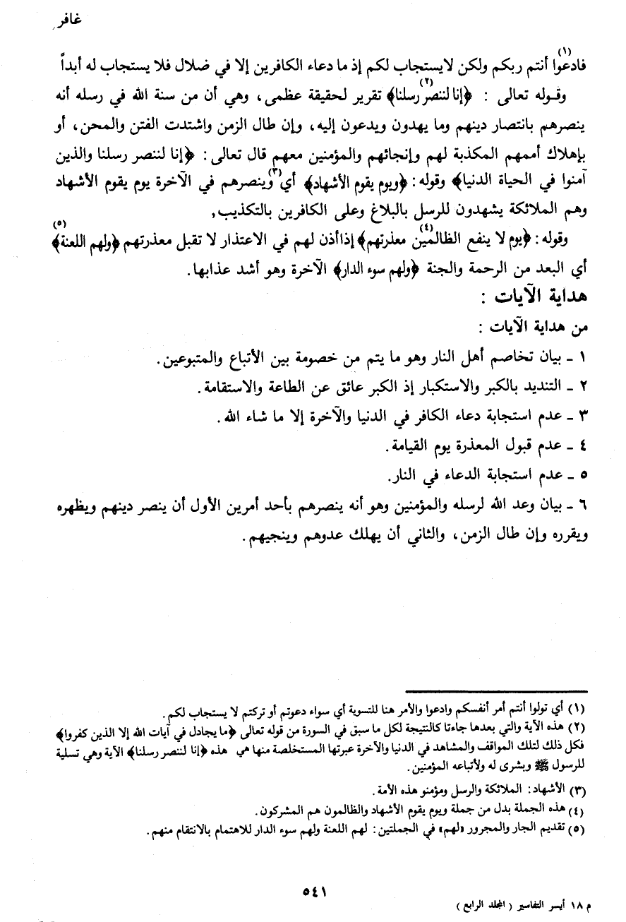 فادعوا (1) أنتم ربكم ولكن لا يستجاب لكم إذ ما دعاء الكافرين إلا في ضلال فلا يستجاب له أبداً وقوله تعالى: {إِنَّا لَنَنْصُرُ (2) رُسُلَنَا} تقرير لحقيقة عظمى، وهي أن من سنة الله في رسله أنه ينصرهم بانتصار دينهم وما يهدون ويدعون إليه، وإن طال الزمن واشتدت الفتن والمحن، أو بإهلاك أممهم المكذبة لهم وإنجائهم والمؤمنين معهم قال تعالى: {إِنَّا لَنَنْصُرُ رُسُلَنَا وَالَّذِينَ آمَنُوا فِي الْحَيَاةِ الدُّنْيَا} وقوله: {وَيَوْمَ يَقُومُ الْأَشْهَادُ} أي (3) وينصرهم في الآخرة يوم يقوم الأشهاد وهم الملائكة يشهدون للرسل بالبلاغ وعلى الكافرين بالتكذيب.