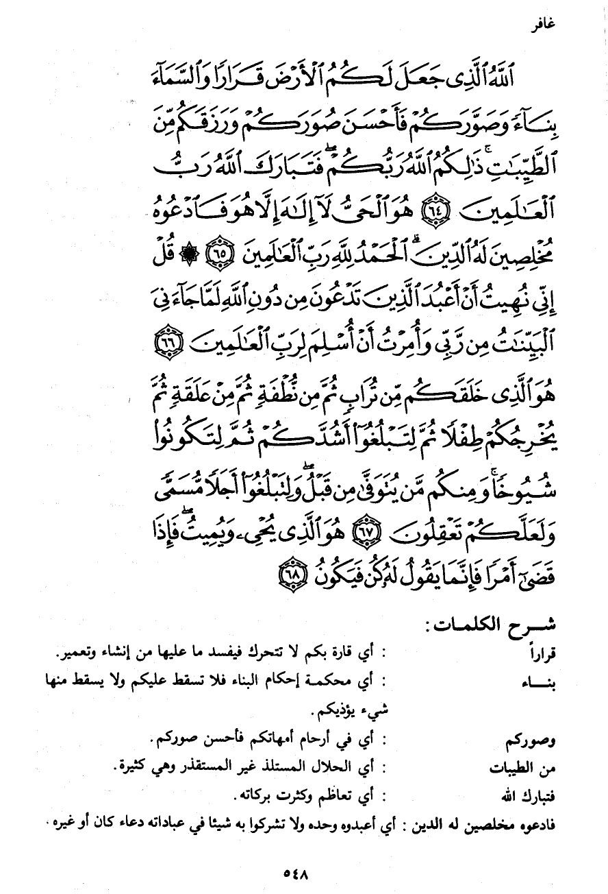 اللهُ الَّذِي جَعَلَ لَكُمُ الْأَرْضَ قَرَاراً وَالسَّمَاءَ بِنَاءً وَصَوَّرَكُمْ فَأَحْسَنَ صُوَرَكُمْ وَرَزَقَكُمْ مِنَ الطَّيِّبَاتِ ذَلِكُمُ اللهُ رَبُّكُمْ فَتَبَارَكَ اللهُ رَبُّ الْعَالَمِينَ (64) هُوَ الْحَيُّ لا إِلَهَ إِلَّا هُوَ فَادْعُوهُ مُخْلِصِينَ لَهُ الدِّينَ الْحَمْدُ لِلَّهِ رَبِّ الْعَالَمِينَ (65) قُلْ إِنِّي نُهِيتُ أَنْ أَعْبُدَ الَّذِينَ تَدْعُونَ مِنْ دُونِ اللهِ لَمَّا جَاءَنِيَ الْبَيِّنَاتُ مِنْ رَبِّي وَأُمِرْتُ أَنْ أُسْلِمَ لِرَبِّ الْعَالَمِينَ (66) هُوَ الَّذِي خَلَقَكُمْ مِنْ تُرَابٍ ثُمَّ مِنْ نُطْفَةٍ ثُمَّ مِنْ عَلَقَةٍ ثُمَّ يُخْرِجُكُمْ طِفْلاً ثُمَّ لِتَبْلُغُوا أَشُدَّكُمْ ثُمَّ لِتَكُونُوا شُيُوخاً وَمِنْكُمْ مَنْ يُتَوَفَّى مِنْ قَبْلُ وَلِتَبْلُغُوا أَجَلاً مُسَمّىً وَلَعَلَّكُمْ تَعْقِلُونَ (67) هُوَ الَّذِي يُحْيِي وَيُمِيتُ فَإِذَا قَضَى أَمْراً فَإِنَّمَا يَقُولُ لَهُ كُنْ فَيَكُونُ (68)