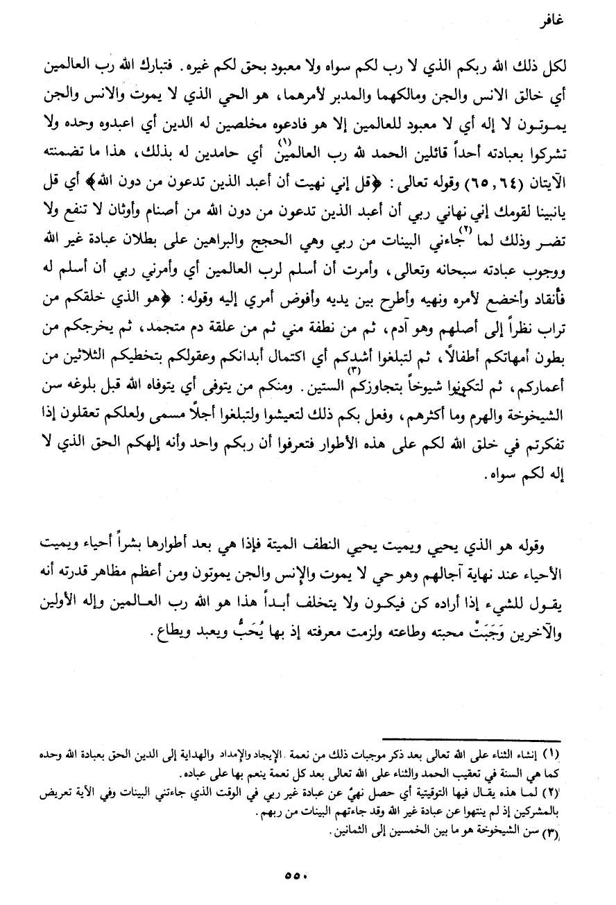 لكل ذلك الله ربكم الذي لا رب لكم سواه ولا معبود بحق لكم غيره. فتبارك الله رب العالمين أي خالق الإنس والجن ومالكهما والمدبر لأمرهما، هو الحي الذي لا يموت والإنس والجن يموتون لا إله أي لا معبود للعالمين إلا هو فادعوه مخلصين له الدين أي اعبدوه وحده ولا تشركوا بعبادته أحداً قائلين الحمد لله رب العالمين (1) أي حامدين له بذلك، هذا ما تضمنته الآيتان (64، 65) وقوله تعالى: {قُلْ إِنِّي نُهِيتُ أَنْ أَعْبُدَ الَّذِينَ تَدْعُونَ مِنْ دُونِ اللهِ} أي قل يا نبينا لقومك إن نهاني ربي أن أعبد الذين تدعون من دون الله من أصنام وأوثان لا تنفع ولا تضر وذلك لما (2) جاءني البينات من ربي وهي الحجج والبراهين على بطلان عبادة غير الله ووجوب عبادته سبحانه وتعالى، وأمرت أن أسلم لرب العالمين أي وأمرني ربي أن أسلم له فأنقاد وأخضع لأمره ونهيه وأطرح بين يديه وأفوض أمري إليه وقوله: {هُوَ الَّذِي خَلَقَكُمْ مِنْ تُرَابٍ} نظراً إلى أصلهم وهو آدم، ثم من نطفة مني ثم من علقة دم متجمد، ثم يخرجكم من بطون أمهاتكم أطفالا، ثم لتبلغوا أشدكم أي اكتمال أبدانكم وعقولكم بتخطيكم الثلاثين من أعماركم، ثم لتكونوا شيوخاً بتجاوزكم (3) الستين. ومنكم من يتوفى أي يتوفاه الله قبل بلوغه سن الشيخوخة والهرم وما أكثرهم، وفعل بكم ذلك لتعيشوا ولتبلغوا أجلاً مسمى ولعلكم تعقلون إذا تفكرتم في خلق الله لكم على هذه الأطوار فتعرفون أن ربكم واحد وأنه إلهكم الحق الذي لا إله لكم سواه.