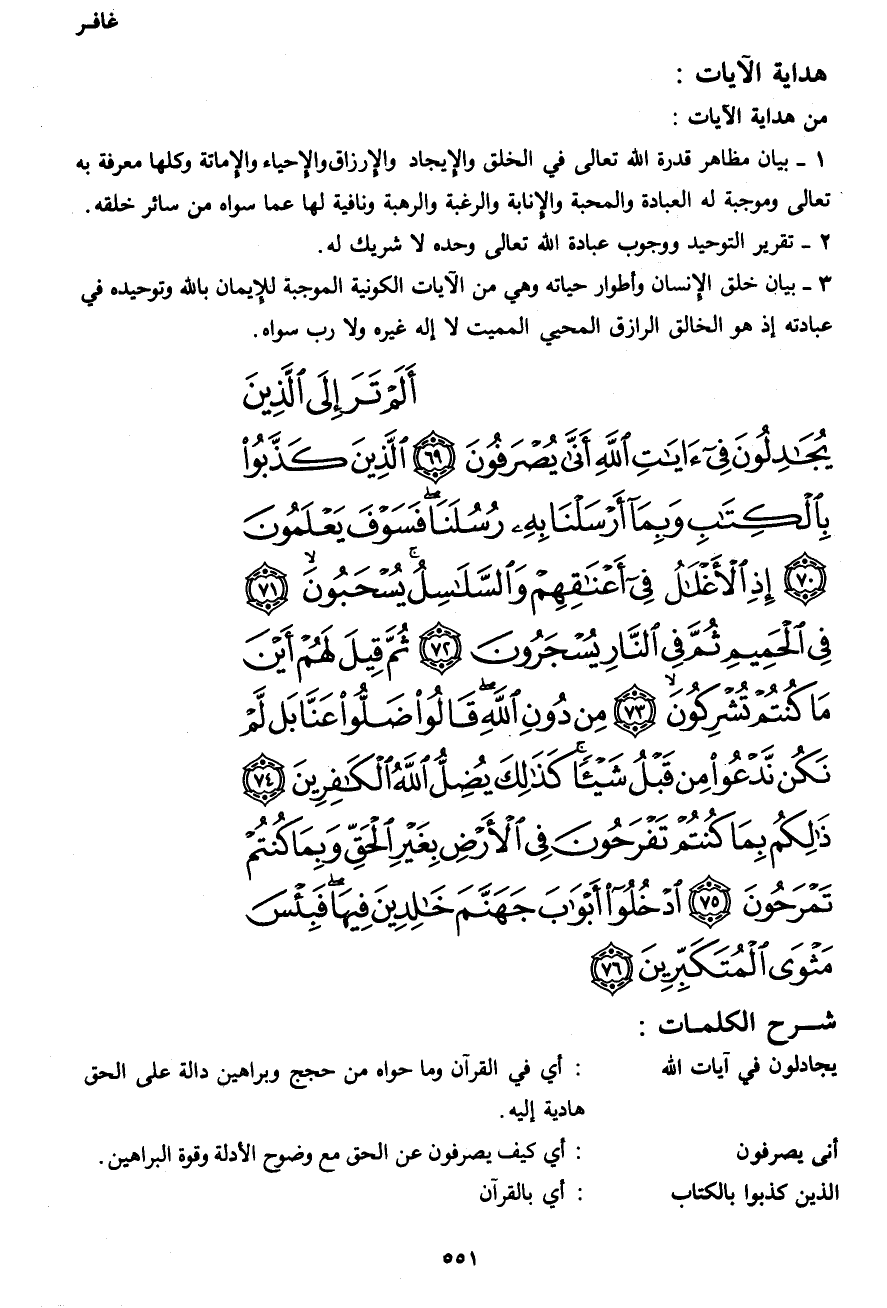 أَلَمْ تَرَ إِلَى الَّذِينَ يُجَادِلُونَ فِي آيَاتِ اللهِ أَنَّى يُصْرَفُونَ (69) الَّذِينَ كَذَّبُوا بِالْكِتَابِ وَبِمَا أَرْسَلْنَا بِهِ رُسُلَنَا فَسَوْفَ يَعْلَمُونَ (70) إِذِ الْأَغْلالُ فِي أَعْنَاقِهِمْ وَالسَّلاسِلُ يُسْحَبُونَ (71) فِي الْحَمِيمِ ثُمَّ فِي النَّارِ يُسْجَرُونَ (72) ثُمَّ قِيلَ لَهُمْ أَيْنَ مَا كُنْتُمْ تُشْرِكُونَ (73) مِنْ دُونِ اللهِ قَالُوا ضَلُّوا عَنَّا بَلْ لَمْ نَكُنْ نَدْعُوا مِنْ قَبْلُ شَيْئاً كَذَلِكَ يُضِلُّ اللهُ الْكَافِرِينَ (74) ذَلِكُمْ بِمَا كُنْتُمْ تَفْرَحُونَ فِي الْأَرْضِ بِغَيْرِ الْحَقِّ وَبِمَا كُنْتُمْ تَمْرَحُونَ (75) ادْخُلُوا أَبْوَابَ جَهَنَّمَ خَالِدِينَ فِيهَا فَبِئْسَ مَثْوَى الْمُتَكَبِّرِينَ (76)