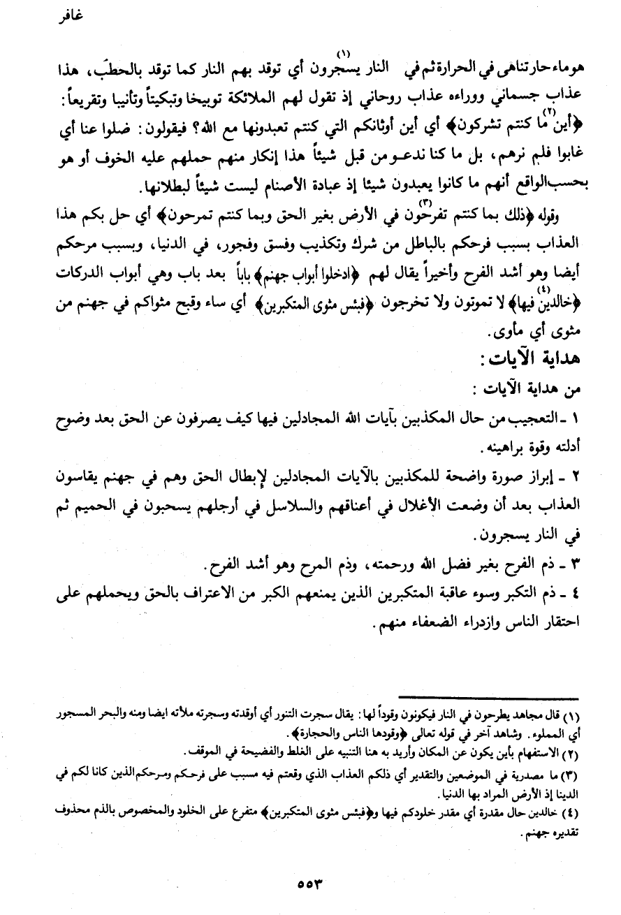 2- إبراز صورة واضحة للمكذبين بالآيات المجادلين لإبطال الحق وهم في جهنم يقاسون العذاب بعد أن وضعت الأغلال في أعناقهم والسلاسل في أرجلهم يسحبون في الحميم ثم في النار يسجرون.