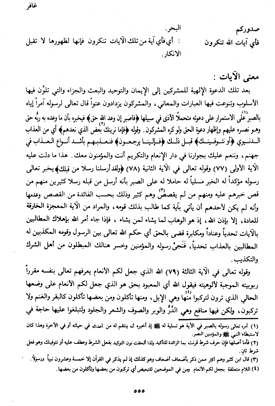 بعد تلك الدعوة الإلهية للمشركين إلى الإيمان والتوحيد والبعث والجزاء والتي تلوّن فيها الأسلوب وتنوّعت فيها العبارات والمعاني، والمشركون يزدادون عتواً قال تعالى لرسوله آمراً إياه بالصبر (1) على الاستمرار على دعوته متحملاً الأذى في سبيلها {فَاصْبِرْ إِنَّ وَعْدَ اللهِ حَقٌّ} فيخبره بأن ما وعده ربه حق وهو نصره عليهم وإظهار دعوة الحق ولو كره المشركون. وقوله: {فَإِمَّا نُرِيَنَّكَ (2) بَعْضَ الَّذِي نَعِدُهُمْ} أي من العذاب الدنيوي {أَوْ نَتَوَفَّيَنَّكَ} قبل ذلك {فَإِلَيْنَا يُرْجَعُونَ} فنعذبهم بأشد أنواع العذاب في جهنم، وننعم عليك بجوارنا في دار الإنعام والتكريم أنت والمؤمنون معك. هذا ما دلت عليه الآية الأولى (77) وقوله تعالى في الآية الثانية (78) {وَلَقَدْ أَرْسَلْنَا رُسُلاً مِنْ قَبْلِكَ} يخبر تعالى رسوله مؤكدا له الخبر مسلياً له حاملاً له على الصبر بأنه أرسل من قبله رسلا كثيرين منهم من قص خبرهم عليه ومنهم من لم يقصص (3) وهم كثير وذلك بحسب الفائدة من القصص وعدمها وأنه لم يكن لأحدهم أن يأتي بآية كما طالب بذلك قومه، والمراد من الآية المعجزة الخارقة للعادة، إلا بإذن الله، إذ هو الوهاب لما يشاء لمن يشاء، فإذا جاء أمر الله بإهلاك المطالبين بالآيات تحدياً وعناداً ومكابرةً قضي بالحق أي حكم الله تعالى بين الرسول وقومه المكذبين له المطالبين بالعذاب تحدياً، فنجَّى رسوله والمؤمنين وخسر هنالك المبطلون من أهل الشرك والتكذيب.