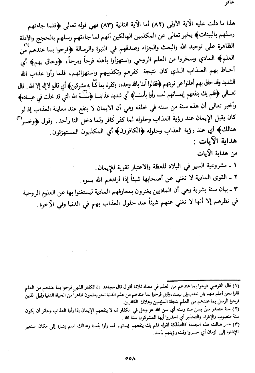 هذا ما دلت عليه الآية الأولى (82) أما الآية الثانية (83) فهي قوله تعالى {فَلَمَّا جَاءَتْهُمْ رُسُلُهُمْ بِالْبَيِّنَاتِ} يخبر تعالى عن المكذبين الهالكين أنهم لما جاءتهم رسلهم بالحجج والأدلة الظاهرة على توحيد الله والبعث والجزاء وصدقهم في النبوة ولرسالة {فَرِحُوا بِمَا عِنْدَهُمْ (1) مِنَ الْعِلْمِ} المادي وسخروا من العلم الروحي واستهزأوا بأهله فرحا ومرحاً، {وَحَاقَ بِهِمْ} أي أحاط بهم العذاب الذي كان نتيجة كفرهم وتكذيبهم واستهزائهم، فلما رأوا عذاب الله الشديد وقد حاق بهم أعلنوا عن توبتهم فـ {قَالُوا آمَنَّا بِاللهِ وَحْدَهُ وَكَفَرْنَا بِمَا كُنَّا بِهِ مُشْرِكِينَ} أي قالوا لا إله إلا الله. قال تعالى {فَلَمْ يَكُ يَنْفَعُهُمْ إِيمَانُهُمْ لَمَّا رَأَوْا بَأْسَنَا} أي شديد عذابنا {سُنَّتَ (2) اللهِ الَّتِي قَدْ خَلَتْ فِي عِبَادِهِ} وأخبر تعالى أن هذه سنة من سننه في خلقه وهي أن الإيمان لا ينفع عند معاينة العذاب إذ لو كان يقبل الإيمان عند رؤية العذاب وحلوله لما كفروا كافر ولما دخل النار أحد. وقوله {وَخَسِرَ (3) هُنَالِكَ} أي عند رؤية العذاب وحلوله {الْكَافِرُونَ} أي المكذبون المستهزئون.
