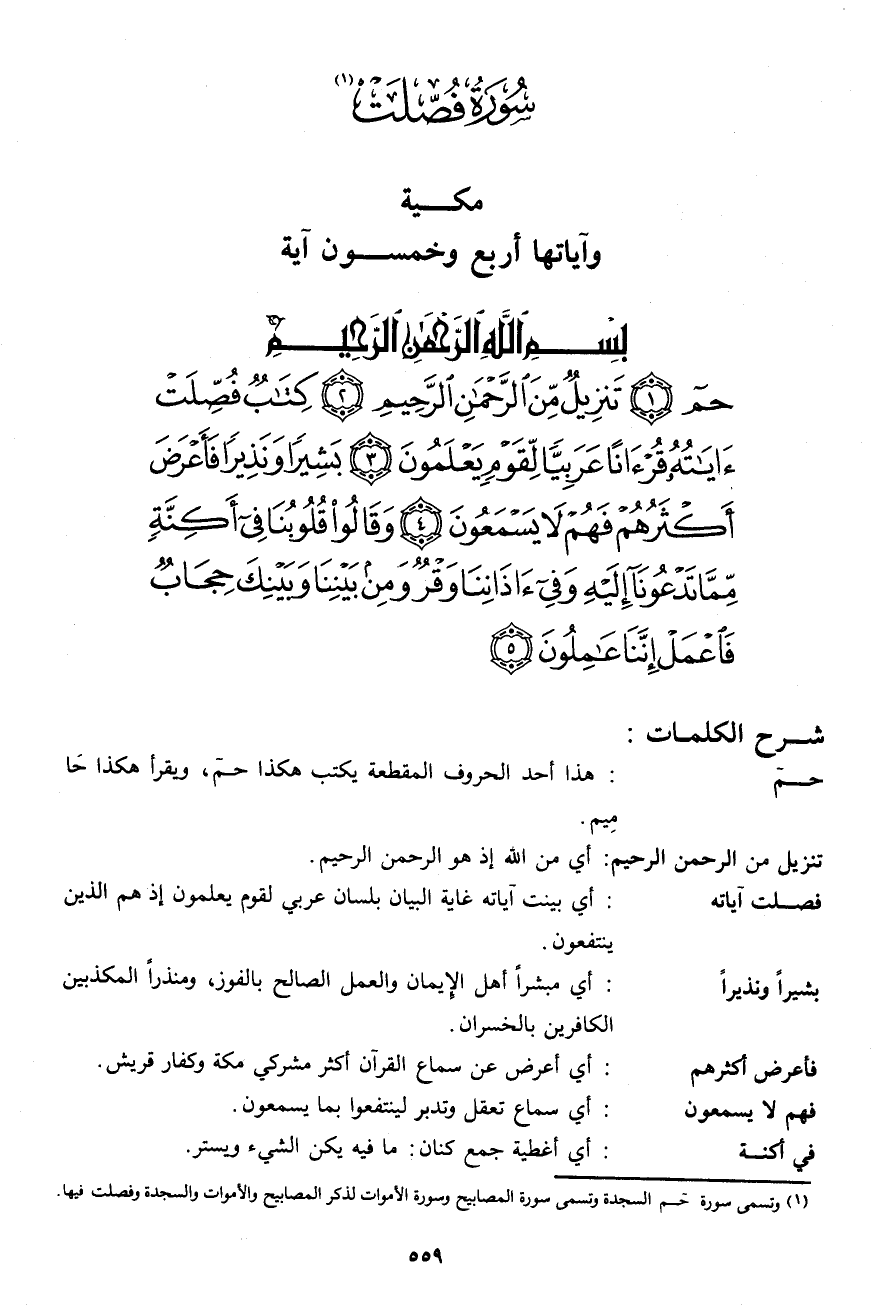حم (1) تَنْزِيلٌ مِنَ الرَّحْمَنِ الرَّحِيمِ (2) كِتَابٌ فُصِّلَتْ آيَاتُهُ قُرْآناً عَرَبِيّاً لِقَوْمٍ يَعْلَمُونَ (3) بَشِيراً وَنَذِيراً فَأَعْرَضَ أَكْثَرُهُمْ فَهُمْ لا يَسْمَعُونَ (4) وَقَالُوا قُلُوبُنَا فِي أَكِنَّةٍ مِمَّا تَدْعُونَا إِلَيْهِ وَفِي آذَانِنَا وَقْرٌ وَمِنْ بَيْنِنَا وَبَيْنِكَ حِجَابٌ فَاعْمَلْ إِنَّنَا عَامِلُونَ (5)