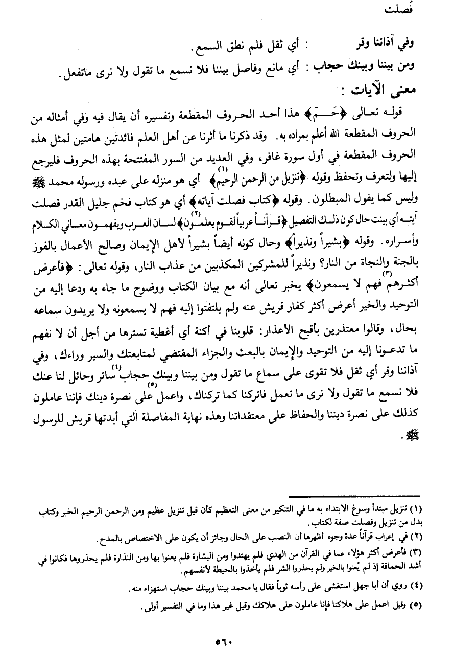 قوله تعالى {حم} هذا أحد الحروف المقطعة وتفسيره أن يقال فيه وفي أمثاله من الحروف المقطعة الله أعلم بمراده به. وقد ذكرنا ما أثرنا عن أهل العلم فائدتين هامتين لمثل هذه الحروف المقطعة في أول سورة غافر، وفي العديد من السور المفتتحة بهذه الحروف فليرجع إليها ولتعرف وتحفظ وقوله {تَنْزِيلٌ مِنَ الرَّحْمَنِ الرَّحِيمِ (1) } أي هو منزله على عبده ورسوله محمد صَلَّى اللهُ عَلَيْهِ وَسَلَّمَ وليس كما يقول المبطلون. وقوله {كِتَابٌ فُصِّلَتْ آيَاتُهُ} أي هو كتاب فخم جليل القدر فصلت آيته أي بينت حال كون ذلك التفصيل {قُرْآناً عَرَبِيّاً لِقَوْمٍ يَعْلَمُونَ (2) } لسان العرب ويفهمون معاني الكلام وأسراره. قوله {بَشِيراً وَنَذِيراً} وحال كونه أيضا بشيراً لأهل الإيمان وصالح الأعمال بالفوز بالجنة والنجاة من النار، نذيراً للمشركين المكذبين من عذاب النار، وقوله تعالى: {فَأَعْرَضَ أَكْثَرُهُمْ (3) فَهُمْ لا يَسْمَعُونَ} يخبر تعالى أنه مع بيان الكتاب ووضوح ما جاء به ودعا إليه من التوحيد والخير أعرض أكثر كفار قريش عنه ولم يلتفتوا إليه فهم لا يسمعونه ولا يريدون سماعه بحال، وقالوا معتذرين بأقبح الأعذار: قلوبنا في أكنة أي أغطية تسترها من أجل أن لا نفهم ما تدعونا إليه من التوحيد والإيمان بالبعث والجزاء المقتضي لمتابعتك والسير وراءك، وفي آذاننا وقر أي ثقل فلا تقوى على سماع ما تقول ومن بيننا وبينك حجاب (4) ساتر وحائل لنا عنك فلا نسمع ما تقول ولا نرى ما تعمل فاتركنا كما تركناك، واعمل (5) على نصرة دينك فإننا عاملون كذلك على نصرة ديننا والحفاظ على معتقداتنا وهذه نهاية المفاصلة التي أبدتها قريش للرسول صَلَّى اللهُ عَلَيْهِ وَسَلَّمَ.