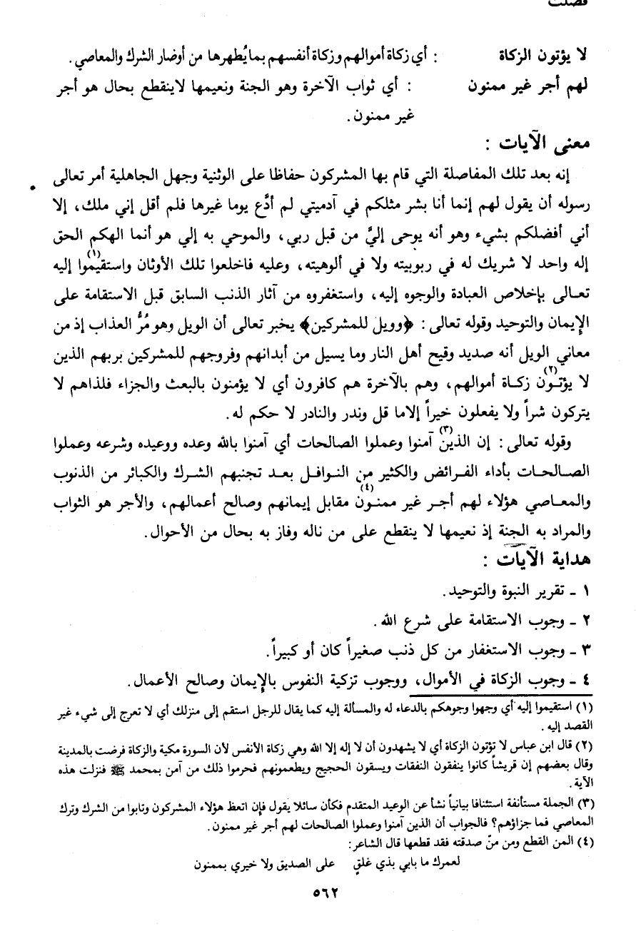 2- قال ابن عباس لا يؤتون الزكاة أي لا يشهدون أن لا إله إلا الله وهي زكاة الأنفس لأن السورة مكية والزكاة فرضت بالمدينة وقال بعضهم إن قريشاً كانوا ينفقون النفقات ويسقون الحجيج ويطعمونهم فحرموا ذلك من آمن بمحمد صَلَّى اللهُ عَلَيْهِ وَسَلَّمَ فنزلت هذه الآية.